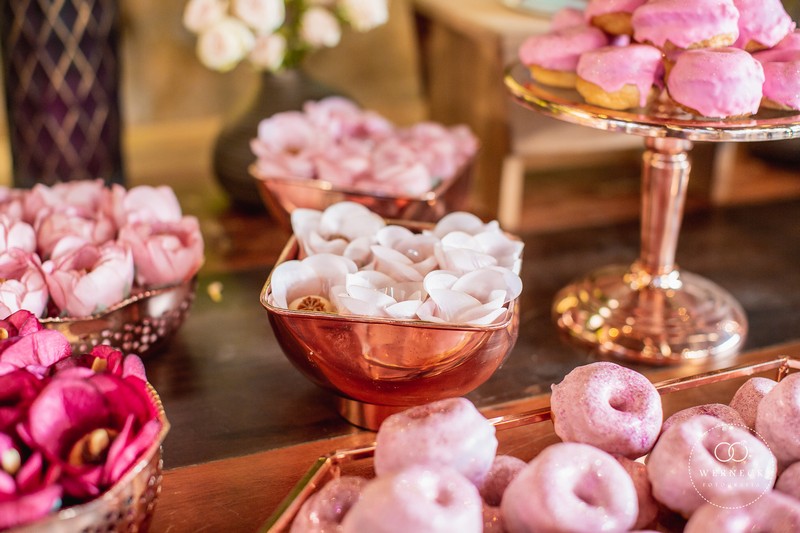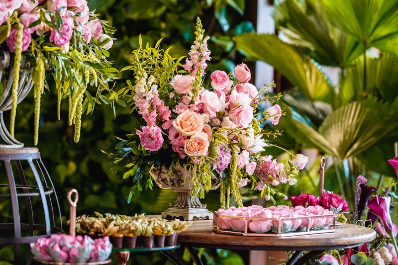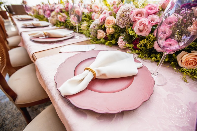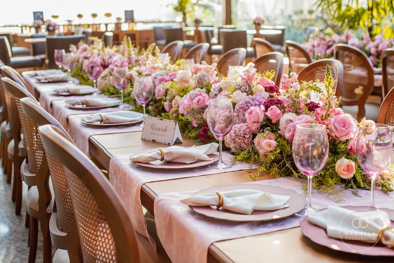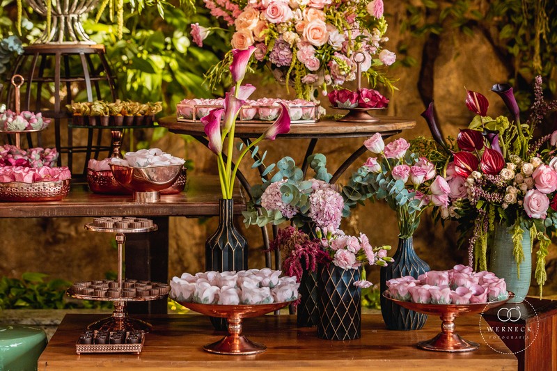 A mesa dos convidados fica um charme que só vendo, com centros de mesa que agregam muito valor no ambiente. Já as famosas rosas são quase que indispensáveis nos casamentos, e quando utilizadas com arranjos florais em lugares estratégicos trazem um cenário sensacional. Já os doces ganham ainda mais atrativos com sua decoração rosa, dando mais água na boca.