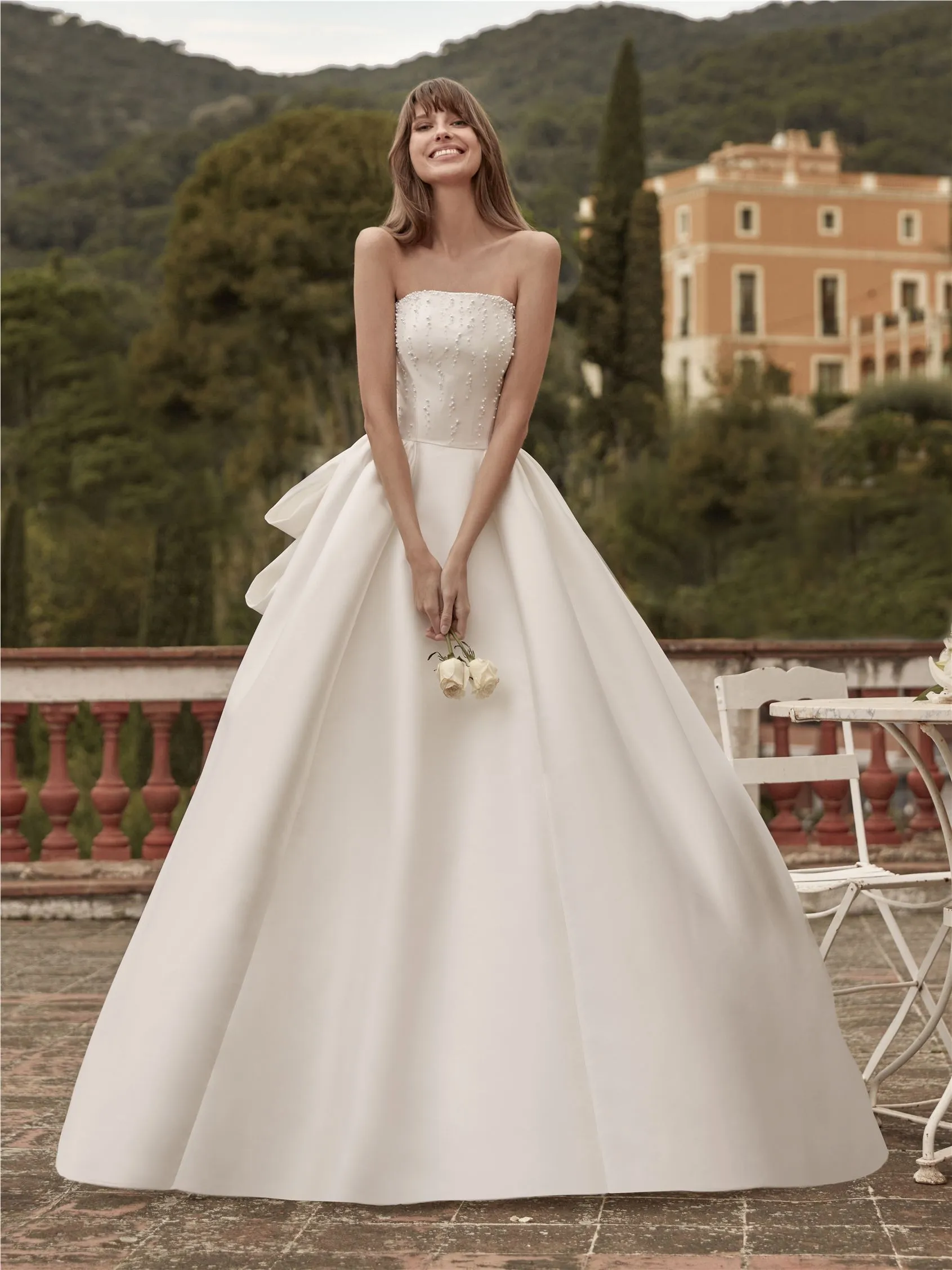 Como o decote V é um clássico, vamos a outro decote clássico: o ombro a ombro. No vestido de noiva minimalista a seguir, ele cria uma simetria com a saia volumosa.