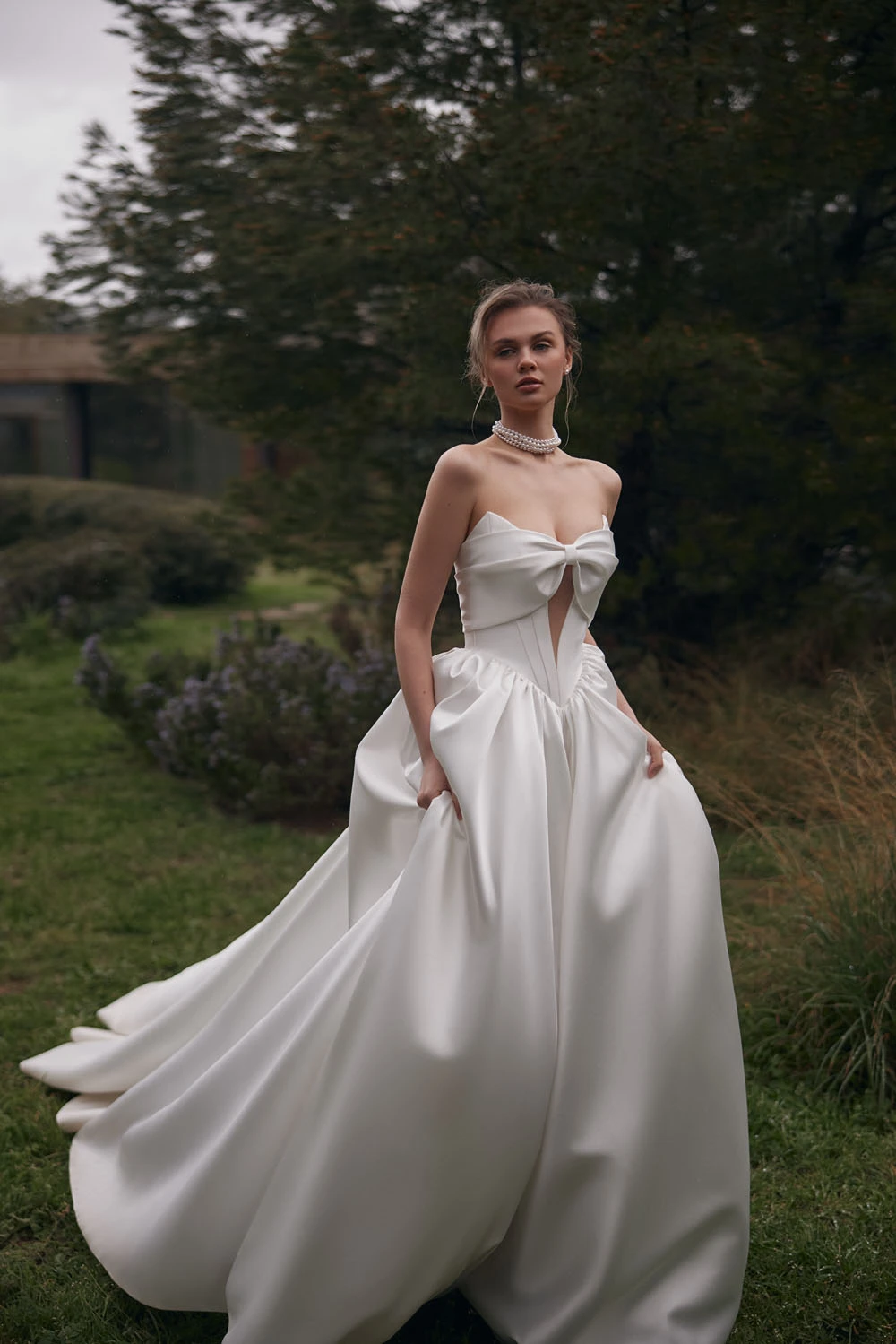 Assim como a flor, o laço também é um elemento clássico, mas geralmente é posicionado na cintura da noiva. Que tal então deslocá-lo para a saia? No modelo a seguir os dois laços laterais ganham destaque criando um ponto focal abaixo dos quadris, que valoriza a cauda do vestido de noiva minimalista.