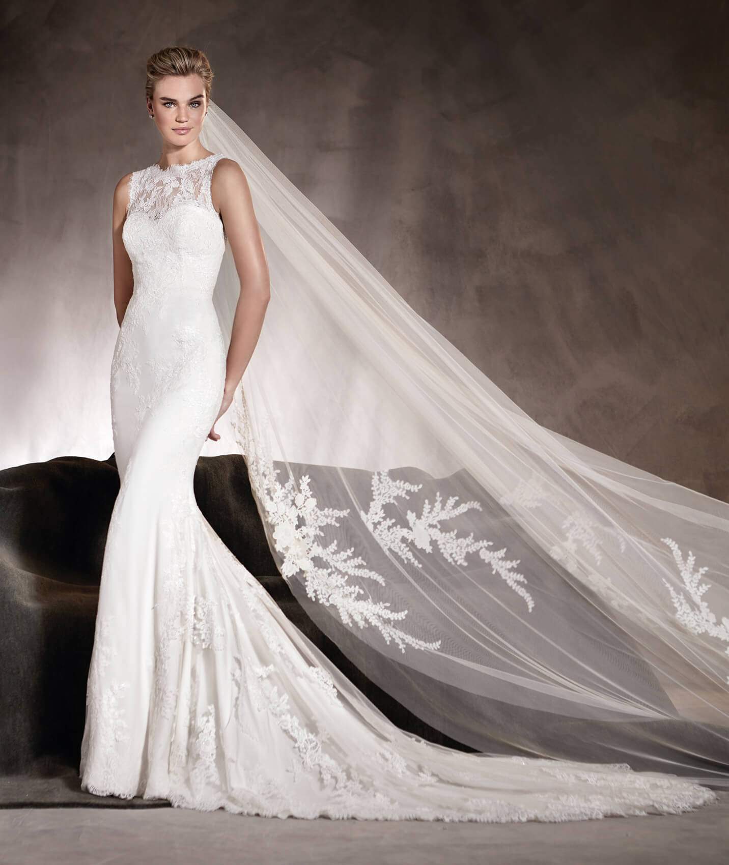 O primeiro é um perfeito vestido-joia: o chantilly, a renda e as aplicações de guipure com pedrarias protagonizam este vestido de noiva realizado em crepe com corte baixo e decote redondo.