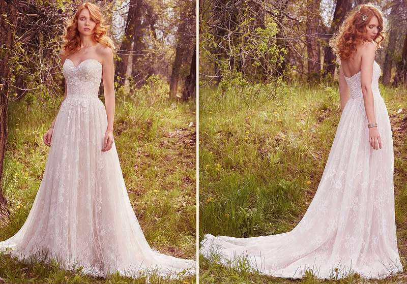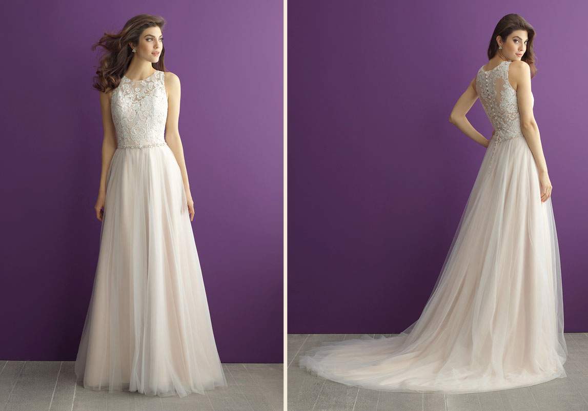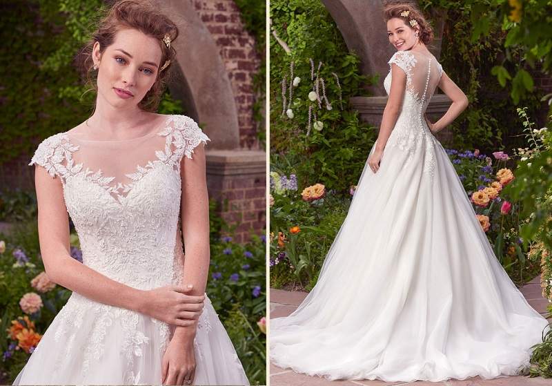 Já este outro tem corte império, decote em barco e combina com perfeição o crepe e o tule aos motivos florais em renda. Na frente, um sugestivo decote em coração.