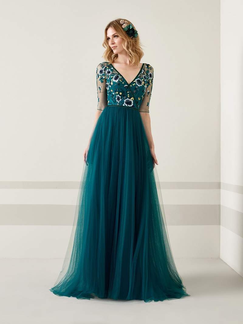 Já neste outro vestido, a saia ampla aparece em um contexto diferente e igualmente lindo: decote V transpassado, que dá aquela alongada na silhueta, cor vibrante e bordados coloridos. Uma peça que vai fazer você brilhar a noite toda, mesmo sem ter detalhes com brilho.