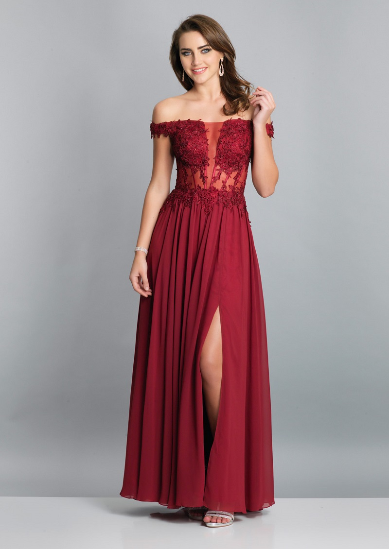 Ainda na tendência da fluidez, temos esse modelo marsala, que tem uma atmosfera mais sensual graças à fenda poderosa na perna e à transparência no corpo.