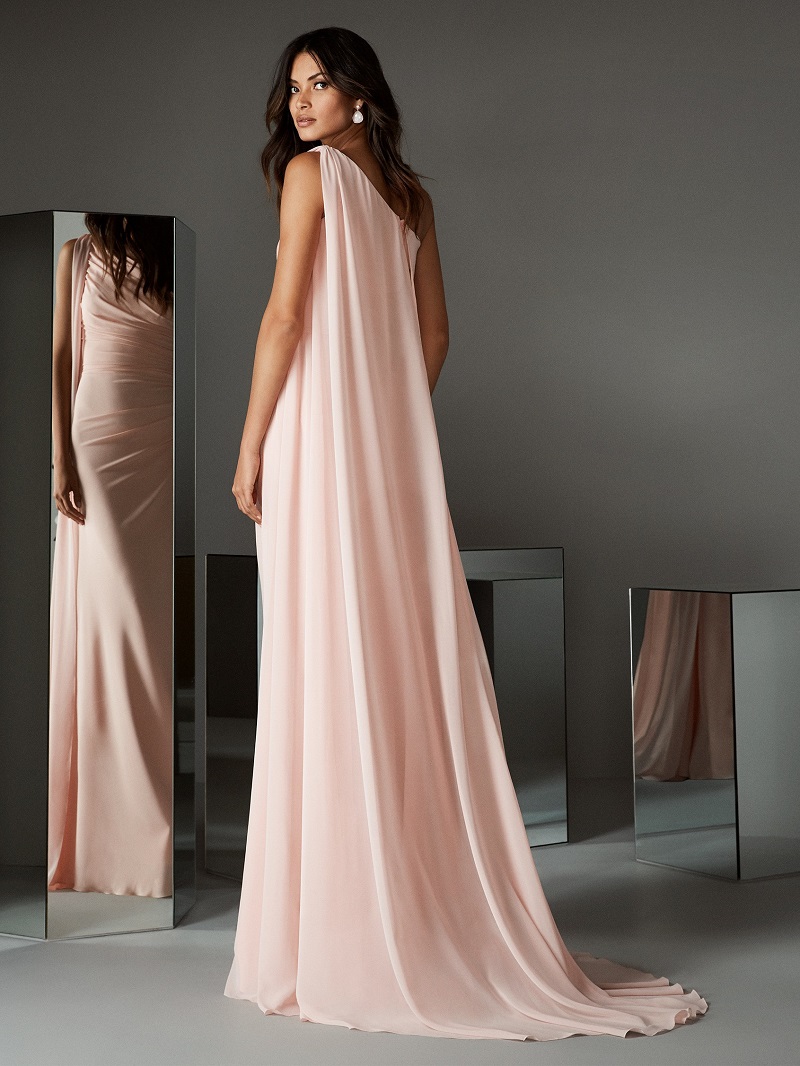 Uma tendência que está super em alta quando falamos de vestidos para casamento modernos são as peças com uma espécie de capa descendo a partir do ombro, como esse, com uma vibe bem deusa grega. No caso dessa peça, ainda temos a assimetria, porque a capa desce de apenas um dos ombros, o que também é uma forma de modernizar o look. O toque clássico de atemporalidade fica por conta da cor.