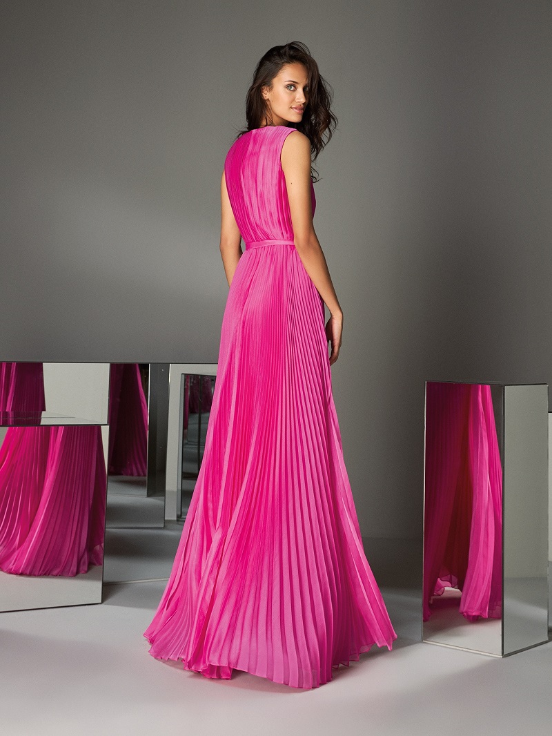 Outro exemplo de recorte na região do decote está nesse vestido, de uma forma mais delicada e romântica. A peça é toda plissada, o que ajuda a alongar a silhueta. E a cintura marcada também deixa o visual mais feminino!