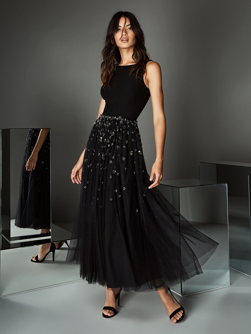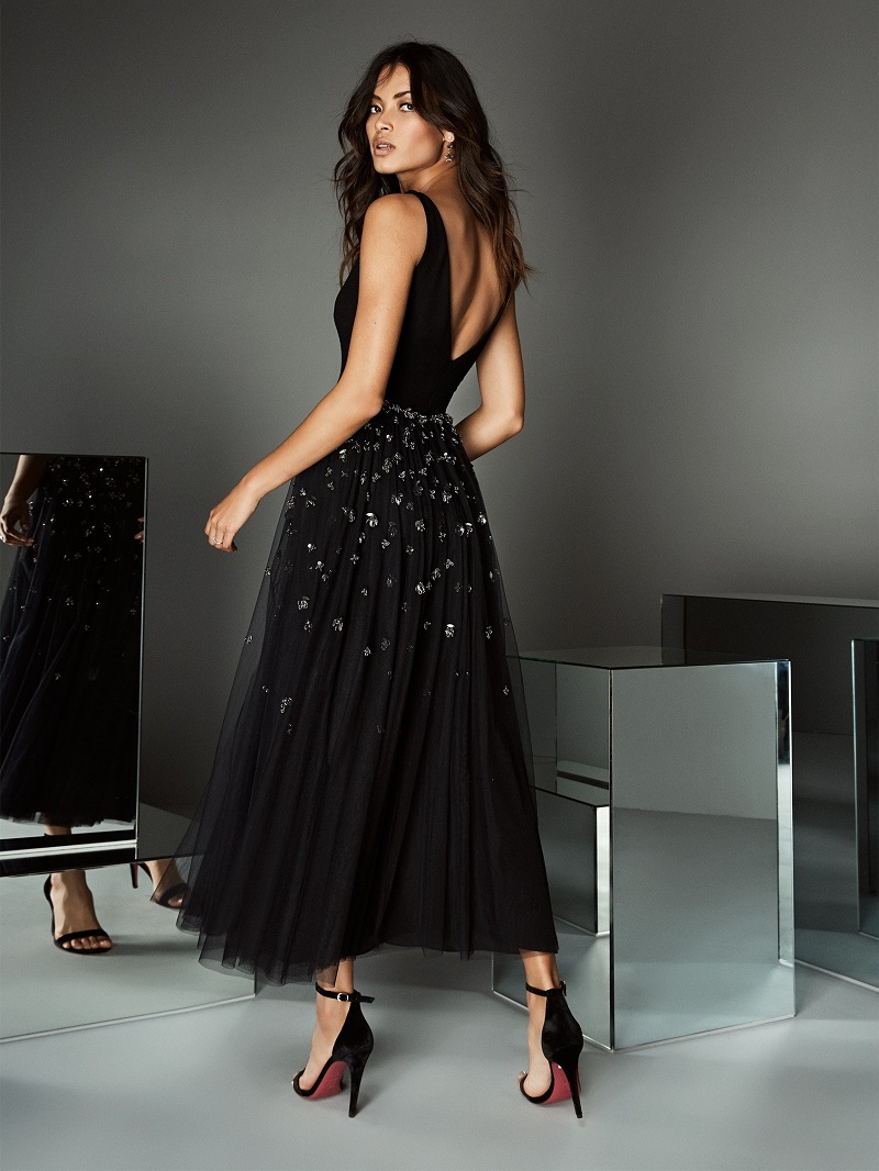 Ao contrário do que muita gente pensa, um vestido escuro pode ser bem-vindo em um casamento a tarde. Desde que esse evento aconteça mais no fim da tarde, se estendendo para a noite. Nesse caso, você pode investir em um modelo como este: a saia de comprimento midi é mais moderna e descontraída, e o tule é leve como pede a ocasião! Perfeito para quem quer sair do óbvio!