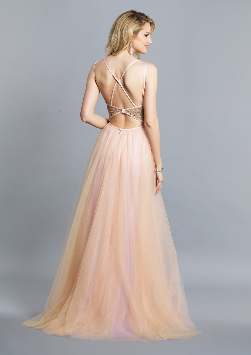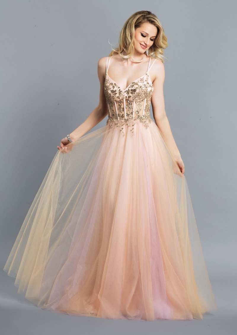 Ainda nessa vibe de tom pastel, temos um modelo bem diferenciado porque tem uma saia bem volumosa com tule, brinca com mais de uma cor, e tem aplicações de brilho no corpo. Mas perceba que mesmo com todos esses detalhes, a peça continua apropriada para um casamento a tarde, por conta do tom claro. Não tem erro mesmo!