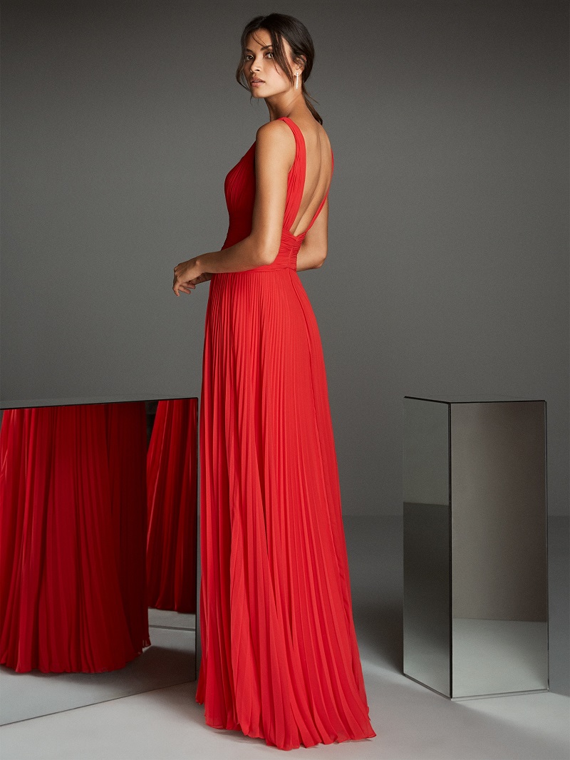 Outra dica para não errar é optar por vestidos lisos, ou seja, sem qualquer bordado. Mas atenção: para que o modelo não seja simples demais, priorize um corte incrível, como esse vermelho divino. A saia plissada e o corpo transpassado fazem toda a diferença, assim como o decote em V que alonga muito a silhueta!