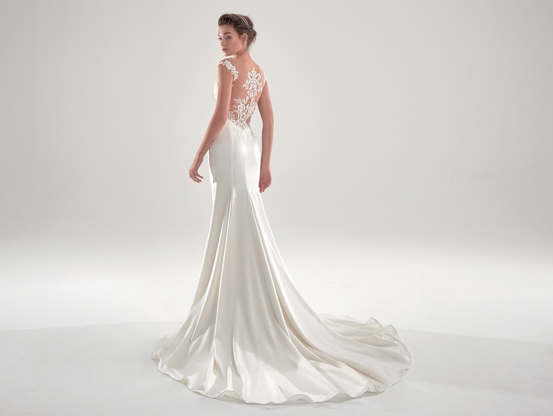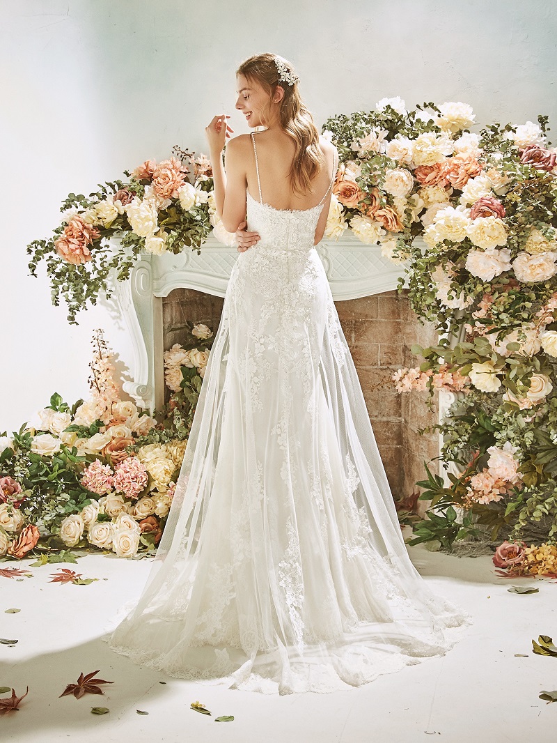 Esse vestido é um bom exemplo disso, com um decote poderoso nas costas, mas mantendo a renda, a saia ampla, a cintura marcada.