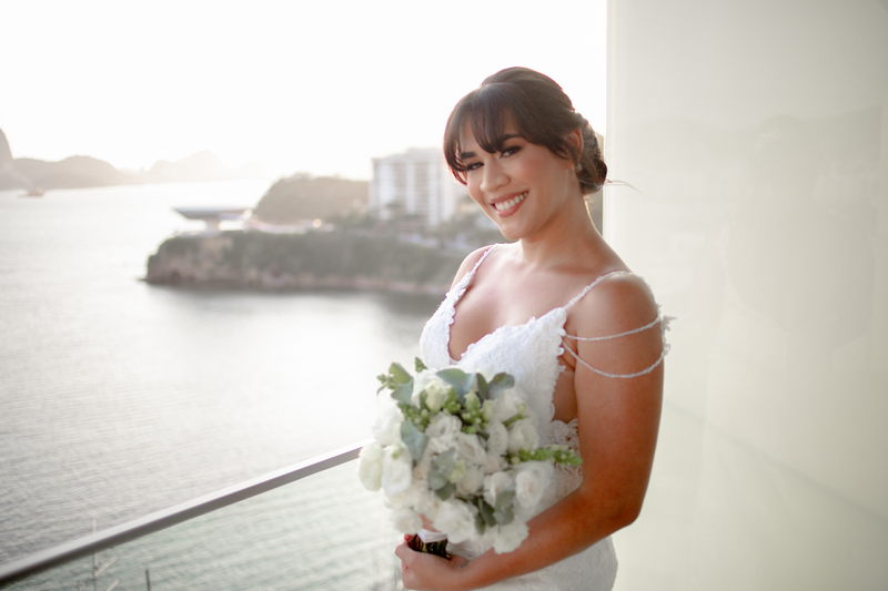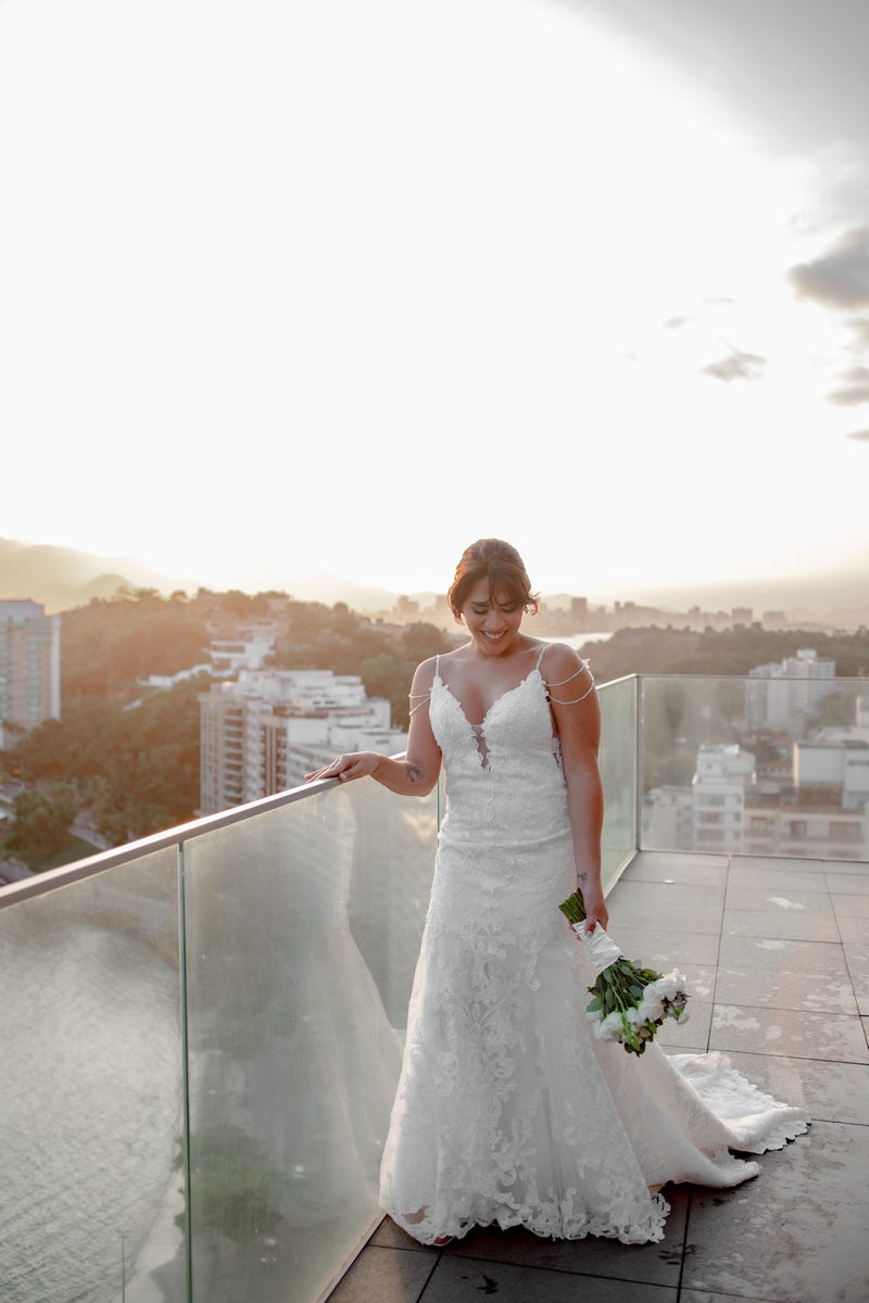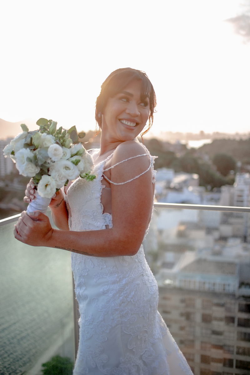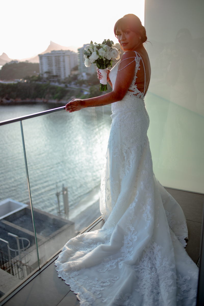 A Lia se casou com um modelo La Modelista impecável, todo trabalhado em renda e com muitos detalhes. Um decote perfeito nas costas, uma alcinha com pedrarias e um caimento bem ao estilo sereia. Ela estava magnifica, com o penteado escolhido, seu buque com flores brancas e o seu vestido de noiva dos sonhos.