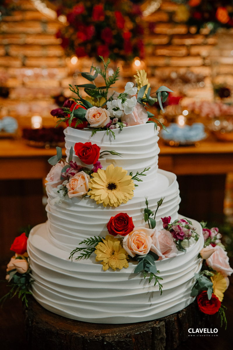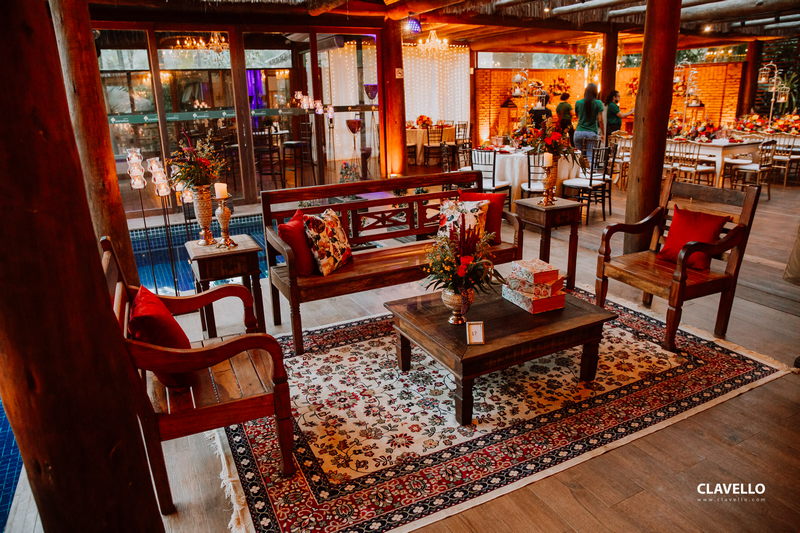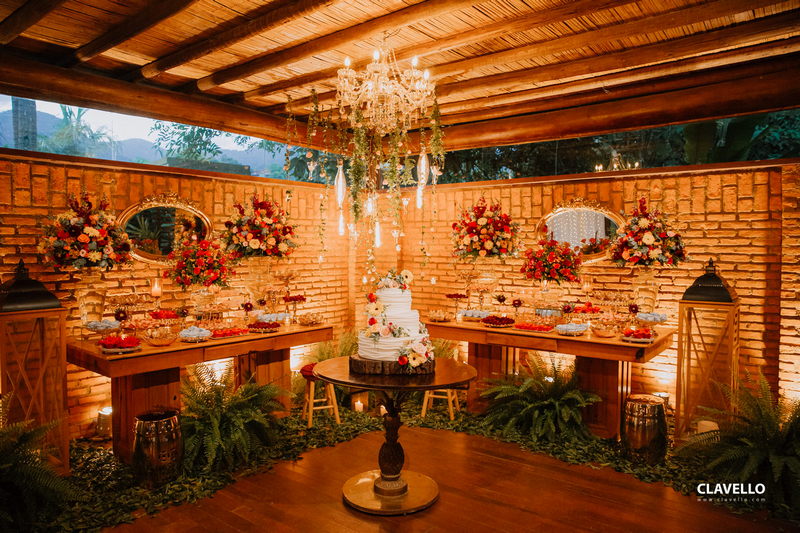 A decoração com toques de vermelho na medida certa, ficou belíssima, com um ar rústico e ao mesmo tempo com toques de sofisticação, adoramos cada pedacinho. O mural de fotos, o espaço aconchegante com guarda sol, a iluminação delicada da mesa do bolo e dos doces, tudo maravilhoso!