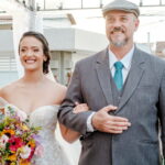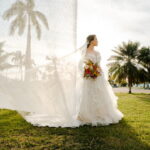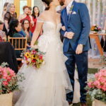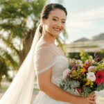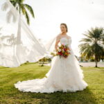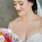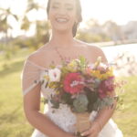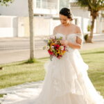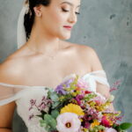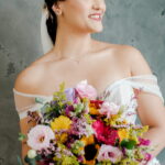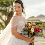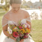 O buquê todo colorido acrescentou um toque de vivacidade ao seu look, onde cada cor representou a alegria e o amor. A combinação perfeita do buquê com o vestido fez com que a noiva brilhasse ainda mais. Ela optou por um penteado preso e maquiagem delicada, realçando a sua beleza natural de maneira sofisticada.