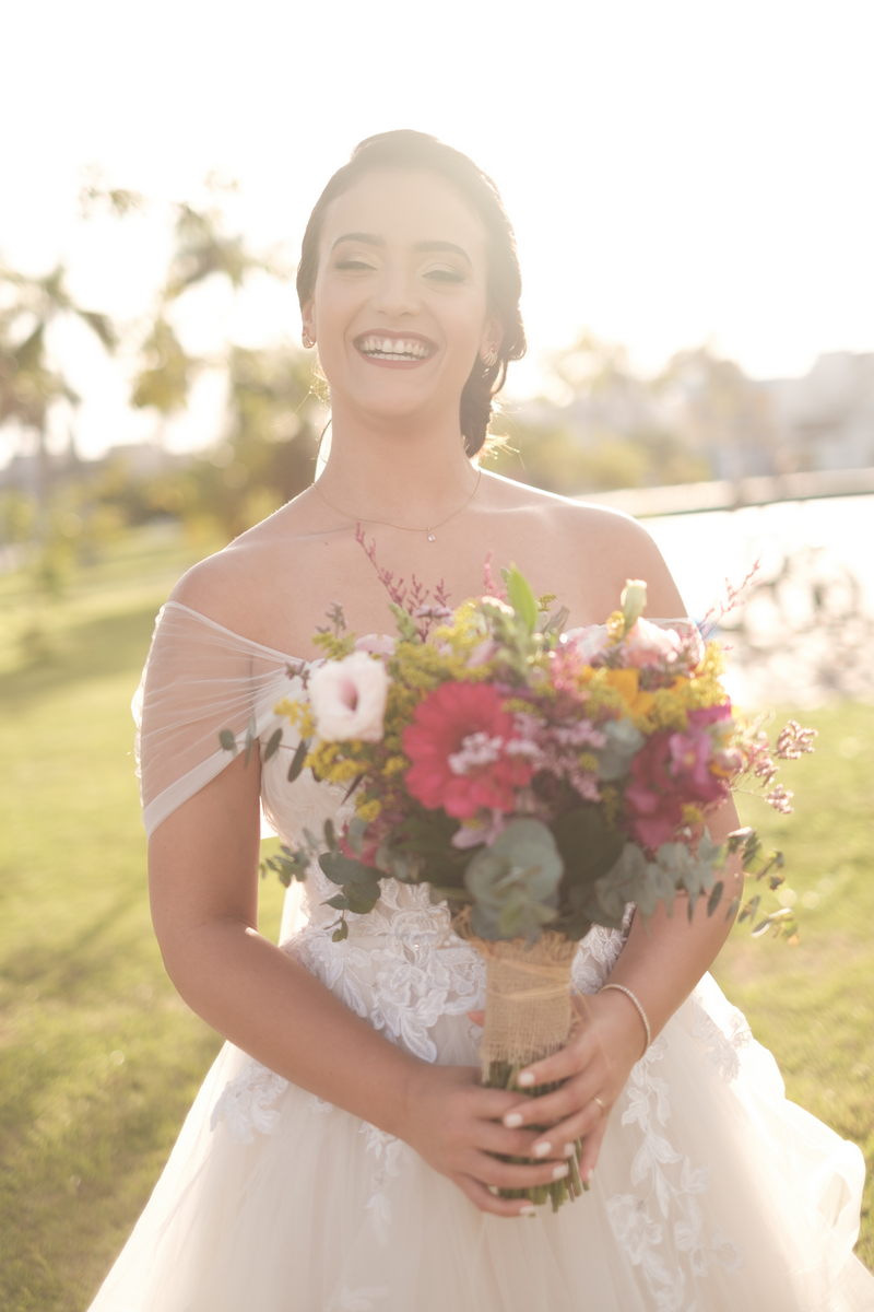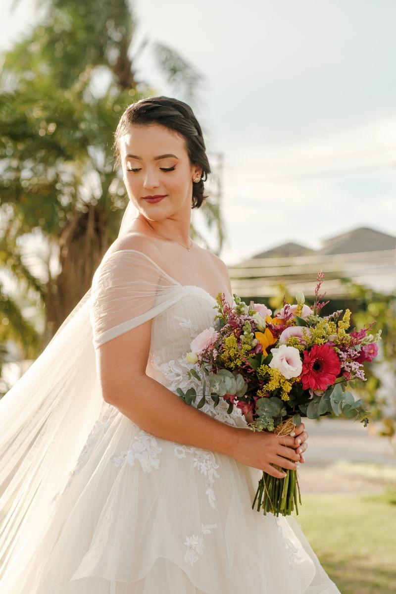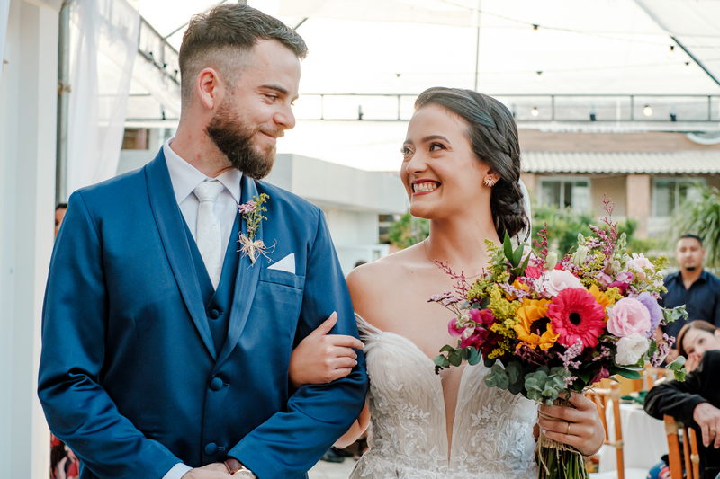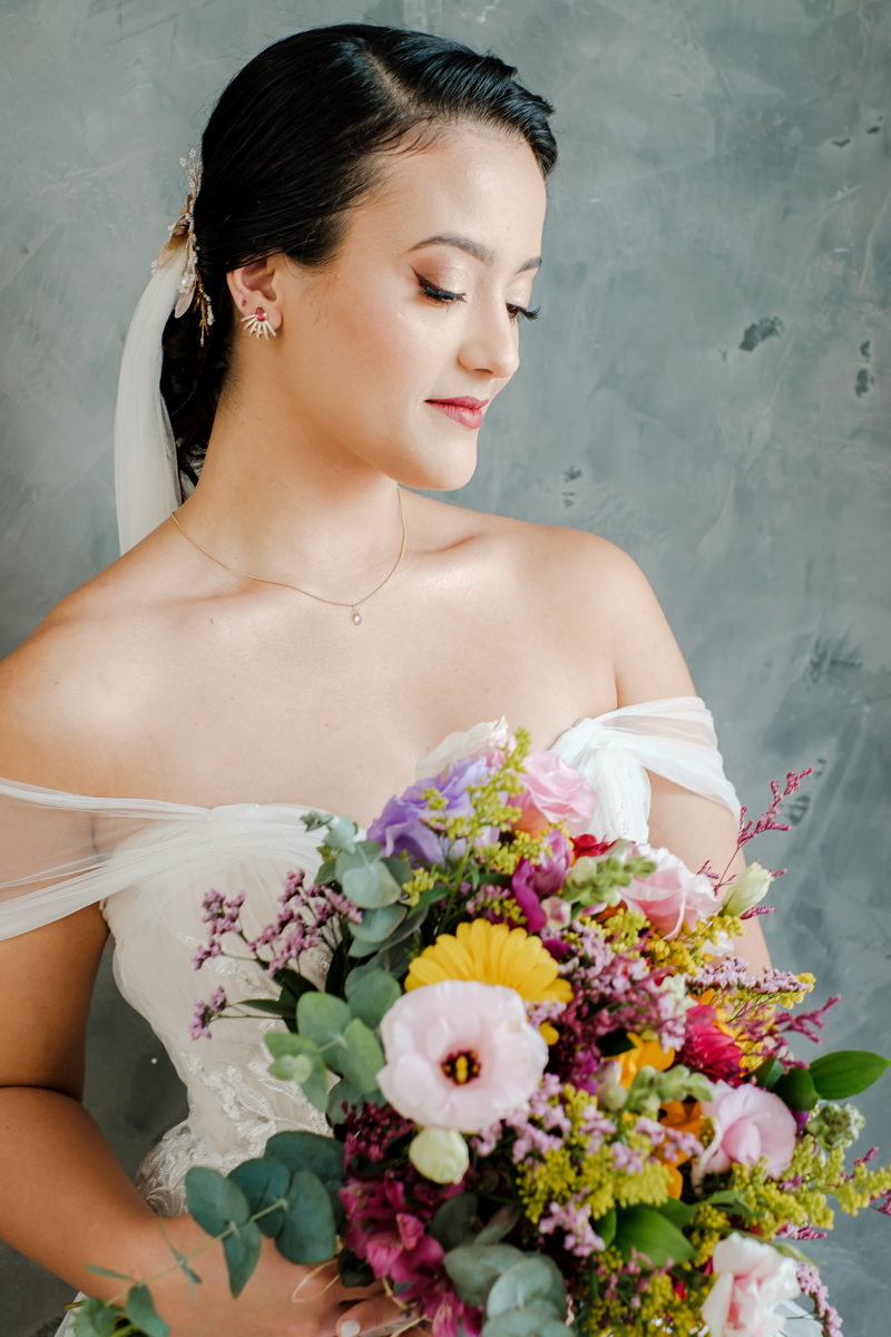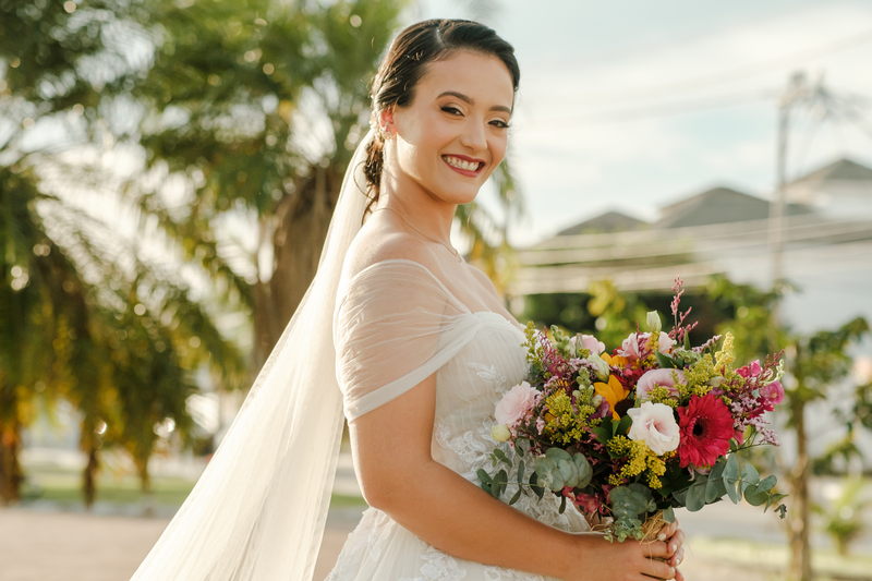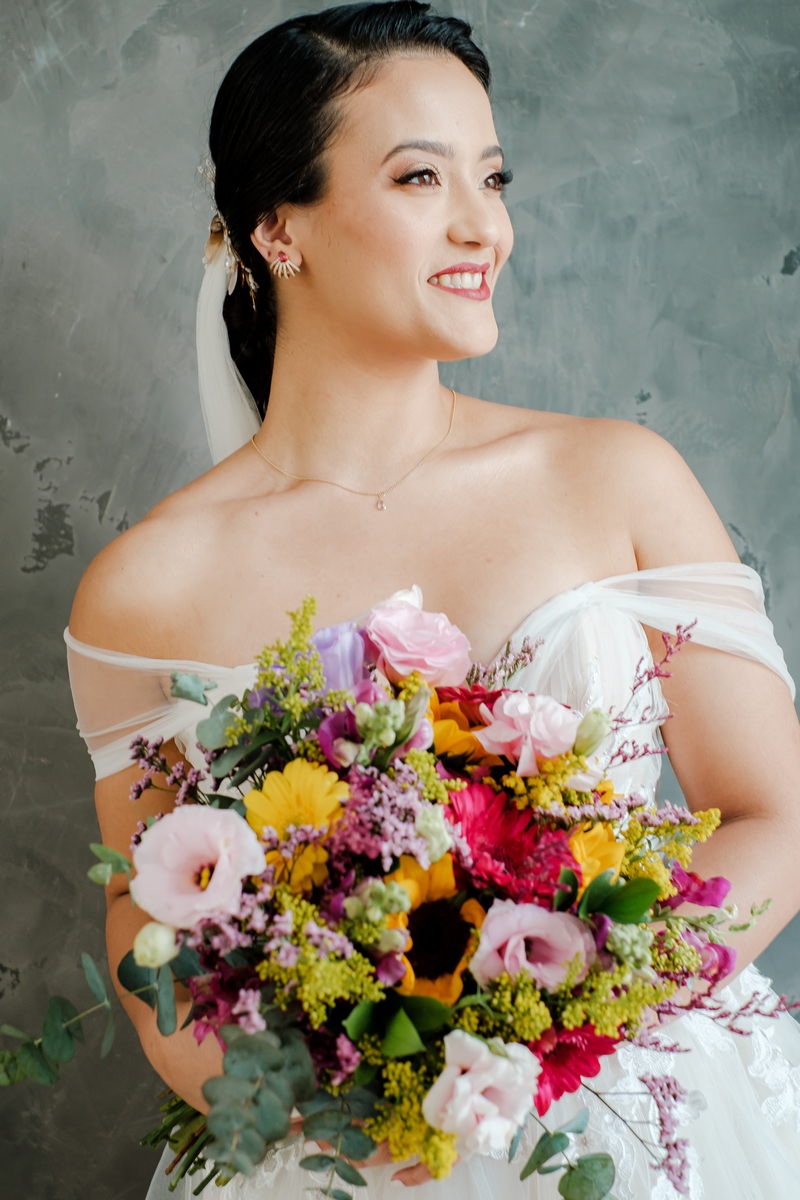 O buquê todo colorido acrescentou um toque de vivacidade ao seu look, onde cada cor representou a alegria e o amor. A combinação perfeita do buquê com o vestido fez com que a noiva brilhasse ainda mais. Ela optou por um penteado preso e maquiagem delicada, realçando a sua beleza natural de maneira sofisticada.