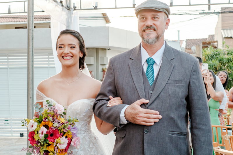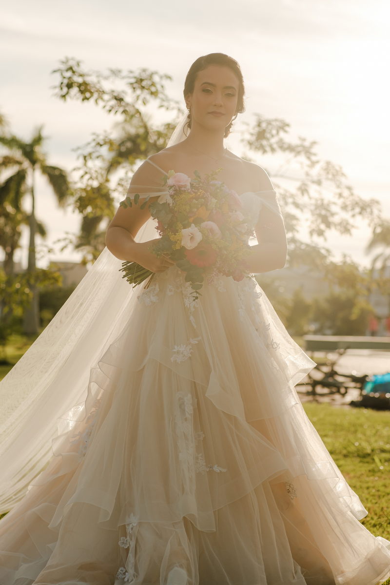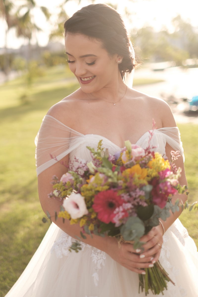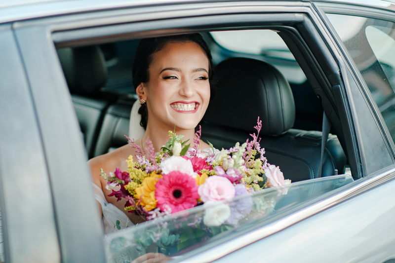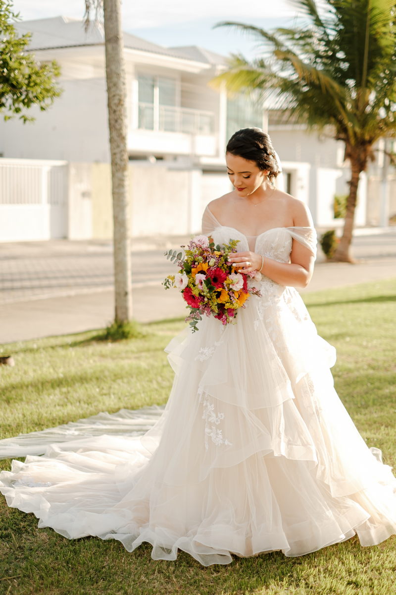 O buquê todo colorido acrescentou um toque de vivacidade ao seu look, onde cada cor representou a alegria e o amor. A combinação perfeita do buquê com o vestido fez com que a noiva brilhasse ainda mais. Ela optou por um penteado preso e maquiagem delicada, realçando a sua beleza natural de maneira sofisticada.