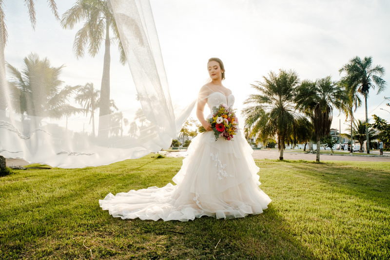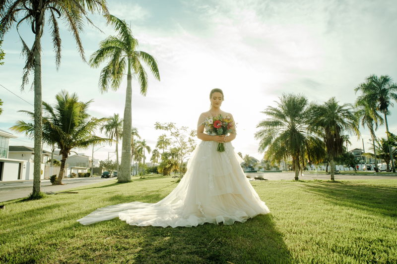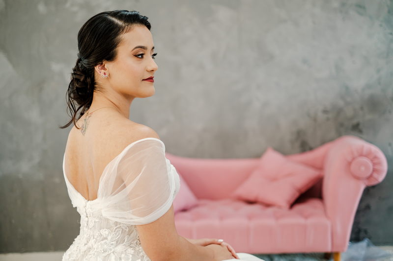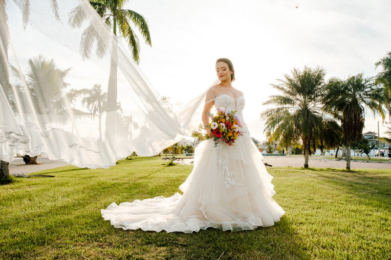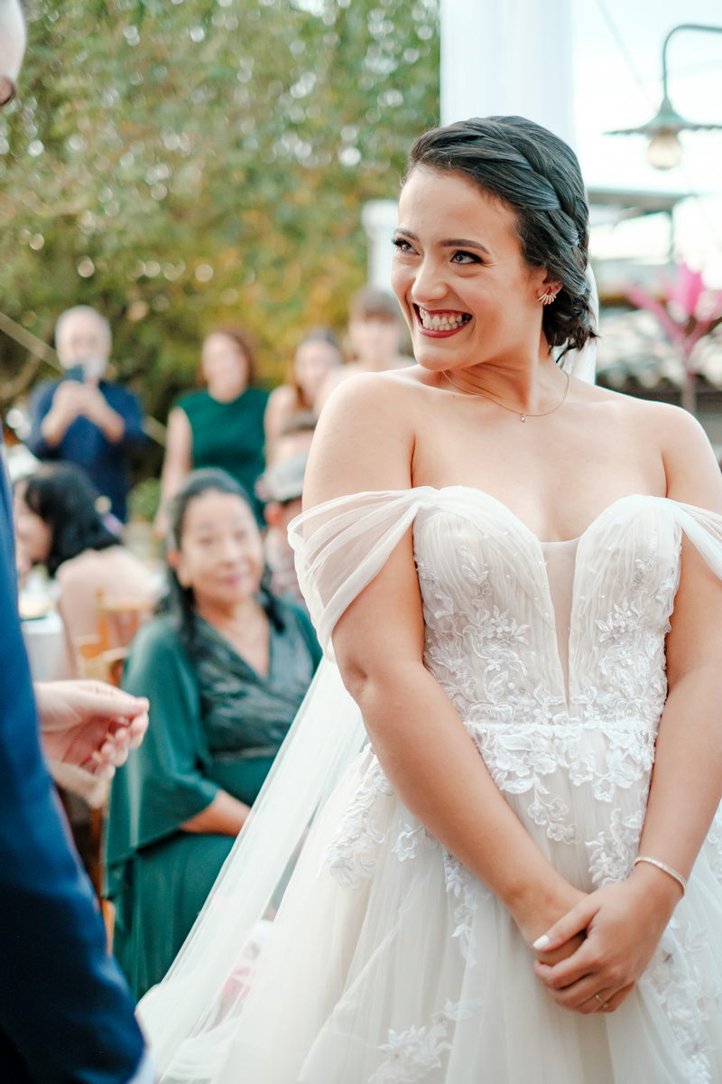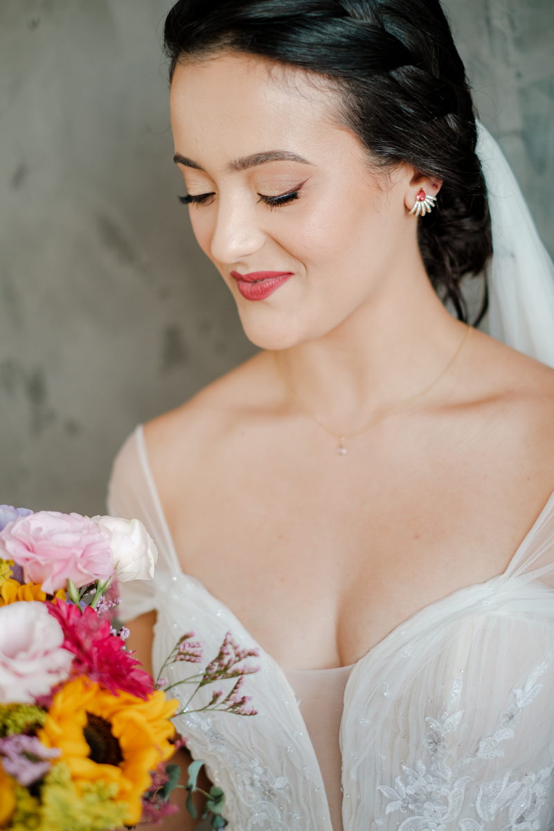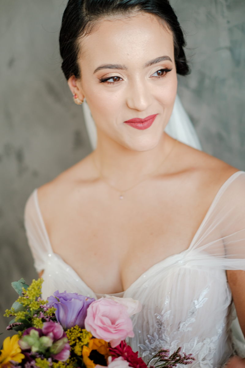O buquê todo colorido acrescentou um toque de vivacidade ao seu look, onde cada cor representou a alegria e o amor. A combinação perfeita do buquê com o vestido fez com que a noiva brilhasse ainda mais. Ela optou por um penteado preso e maquiagem delicada, realçando a sua beleza natural de maneira sofisticada.