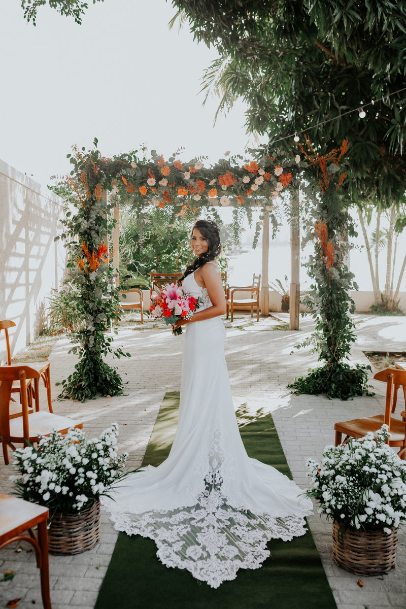 A Monique optou por um vestido de noiva Internovias, um modelo belíssimo minimalista com um trabalho em renda incrível na cauda e lindo decote nas costas. Um look perfeito que destacou anda mais a sua beleza e foi complementado em harmonia com seu lindo buquê de flores e penteado. Amamos todo o seu look noiva!