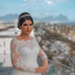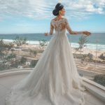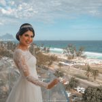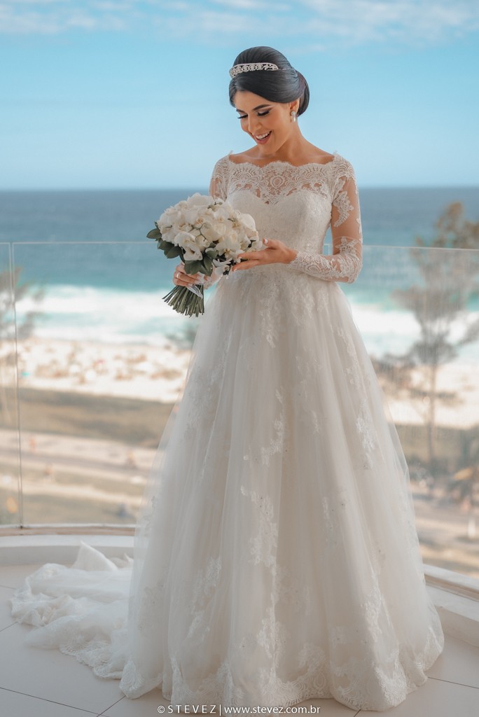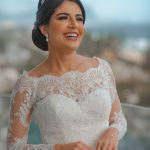 A Ingryd sonhava vestido de noiva estilo princesa com cauda bem longa, e encontrou o seu modelo La Modelista perfeito, com mangas longas, rendas super trabalhadas que deram um toque de romantismo e sensualidade, e lindo decote ombro a ombro. Ela estava divina!