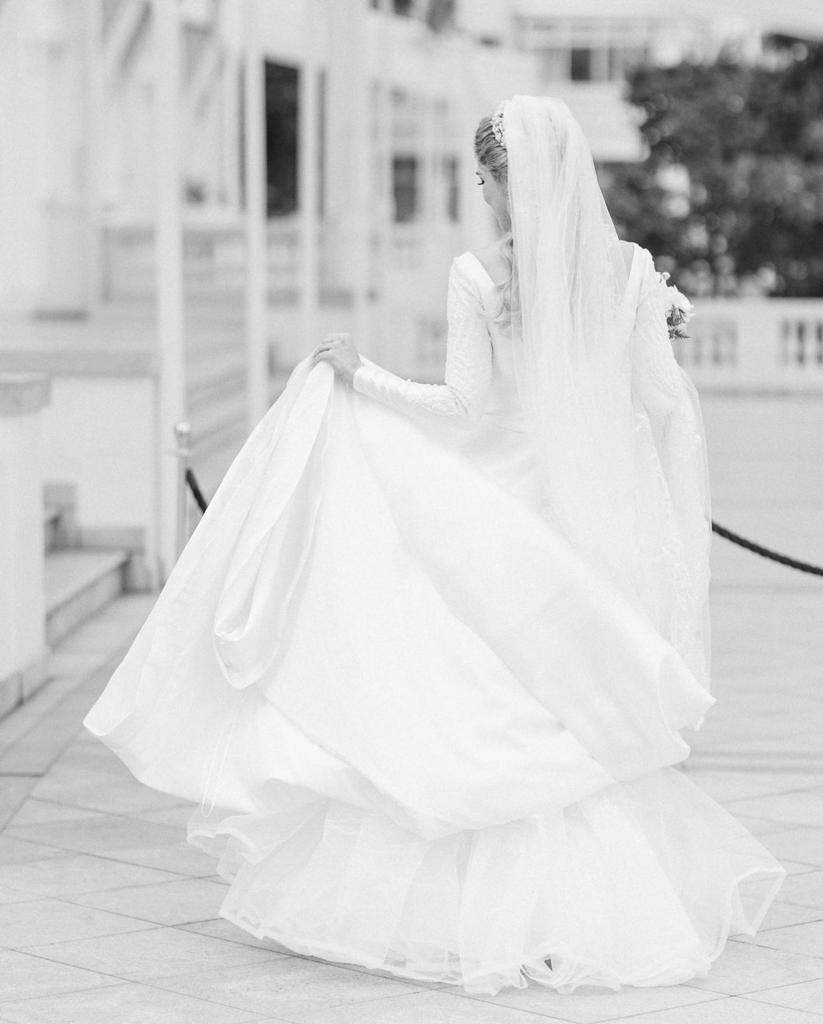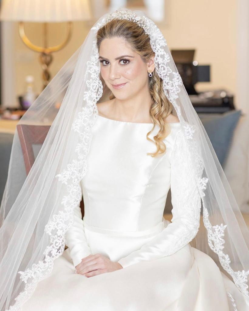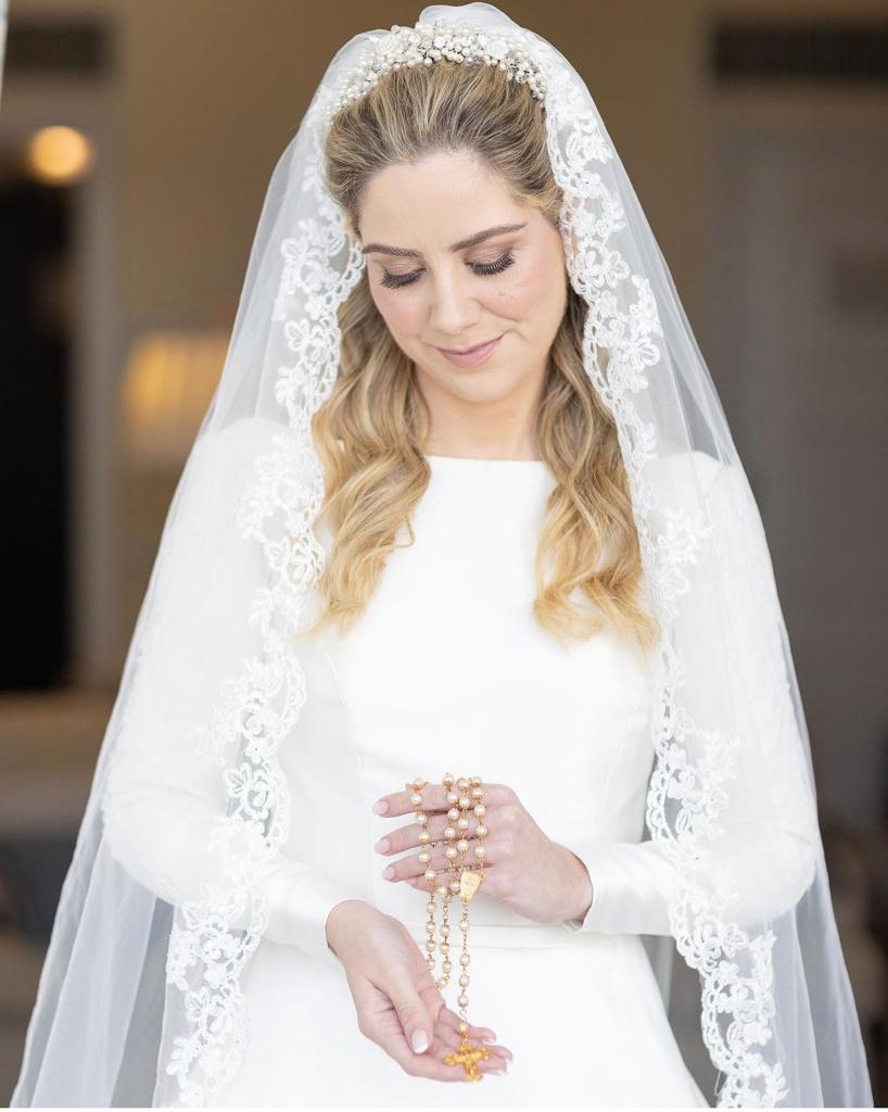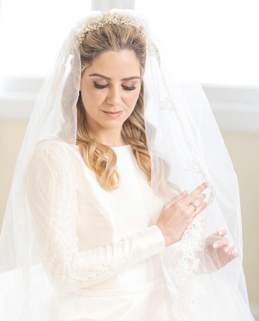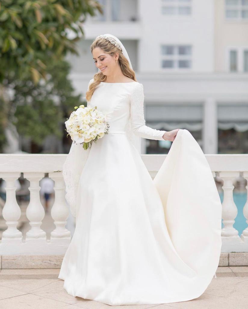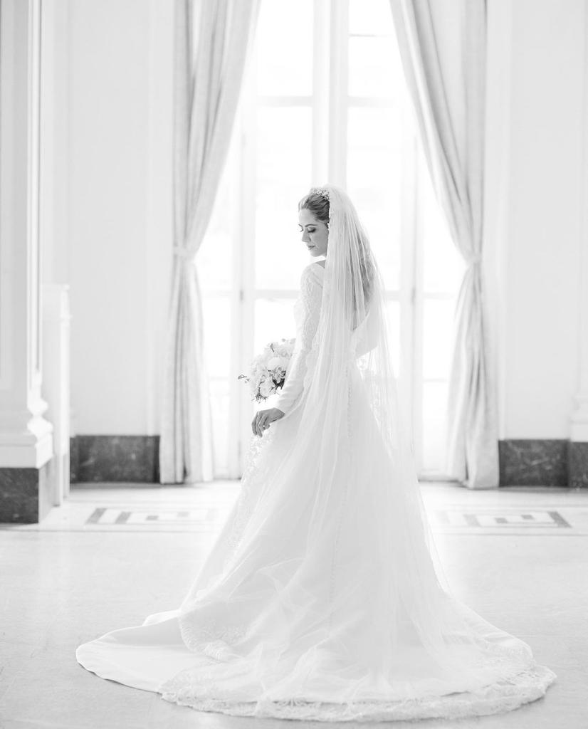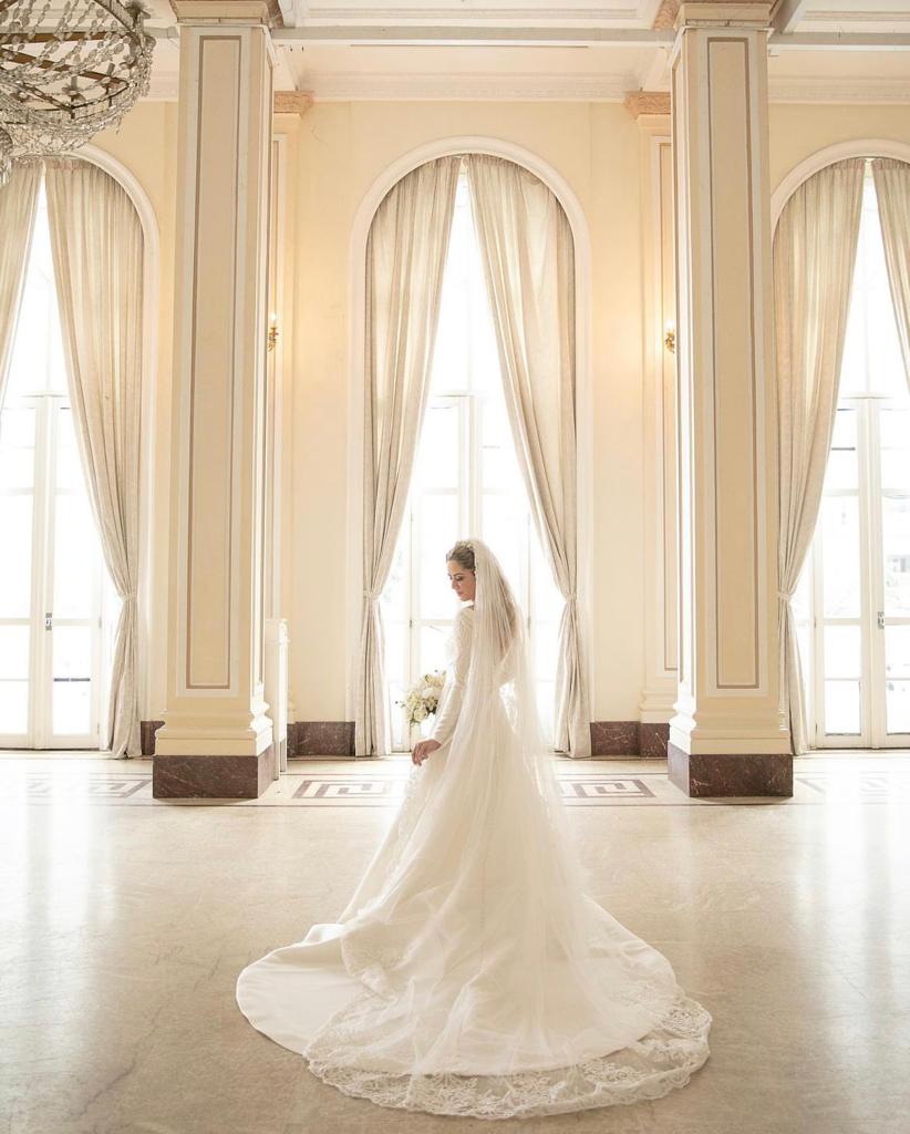 Juliana optou por um vestido de noiva La Modelista no estilo minimalista, com lindo decote nas costas e super elegante. A mantilha com renda delicada deu o toque final ao look e destacou ainda mais a beleza da noiva. Amamos todos os detalhes!