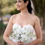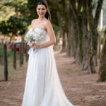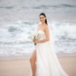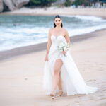 O ponto alto de toda a celebração, e que capturou a atenção de todos, foi a deslumbrante noiva Leticia. O seu vestido de noiva La Modelista, com o caimento impecável, abraçou sua silhueta de forma delicada, permitindo que ela se movesse com graça e naturalidade pela areia. O decote coração, um clássico atemporal, realçou a sua feminilidade, enquanto o corpete, adornado com uma renda delicada, trouxe romantismo. Mas foi a fenda alta, estrategicamente posicionada na perna esquerda, que trouxe um elemento de modernidade e sensualidade discreta. A beleza radiante de Leticia foi realçada pela maestria da @leticiachagasmakeup, que soube capturar a essência da noiva e traduzi-la em uma maquiagem e penteado impecáveis, resistentes à brisa do mar e à emoção do dia.