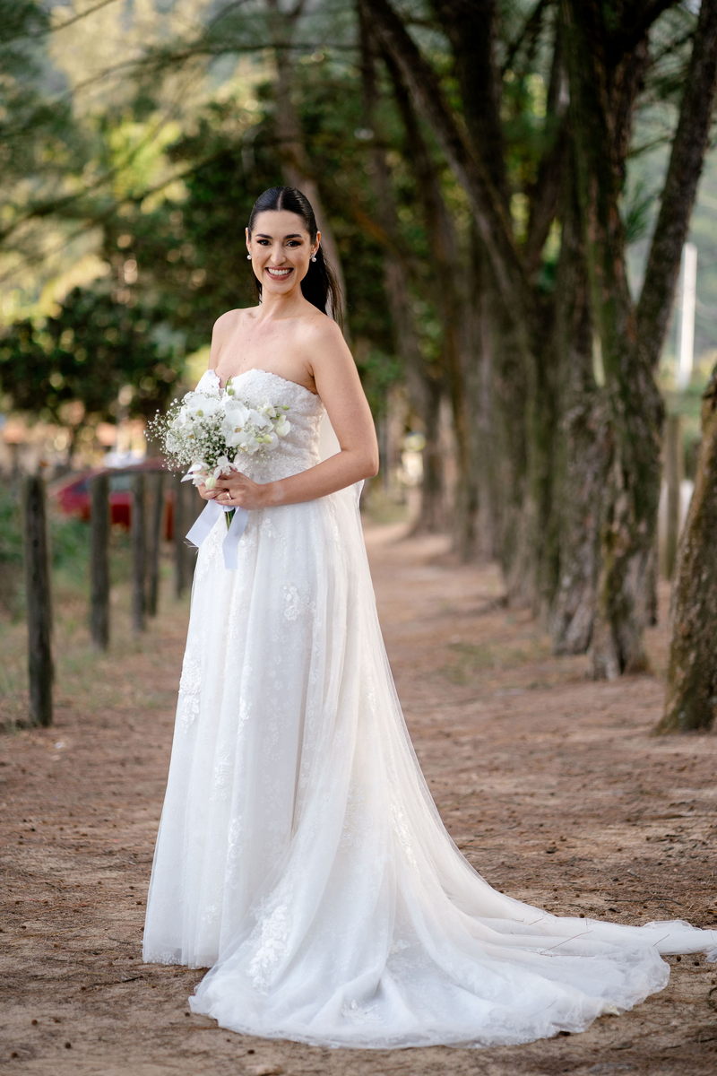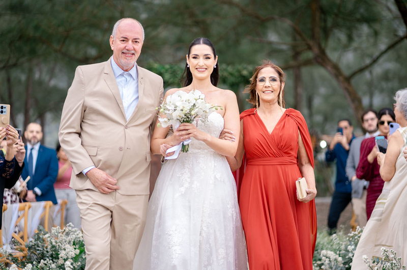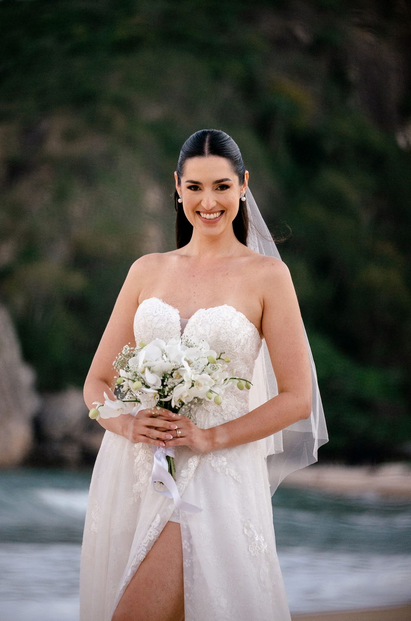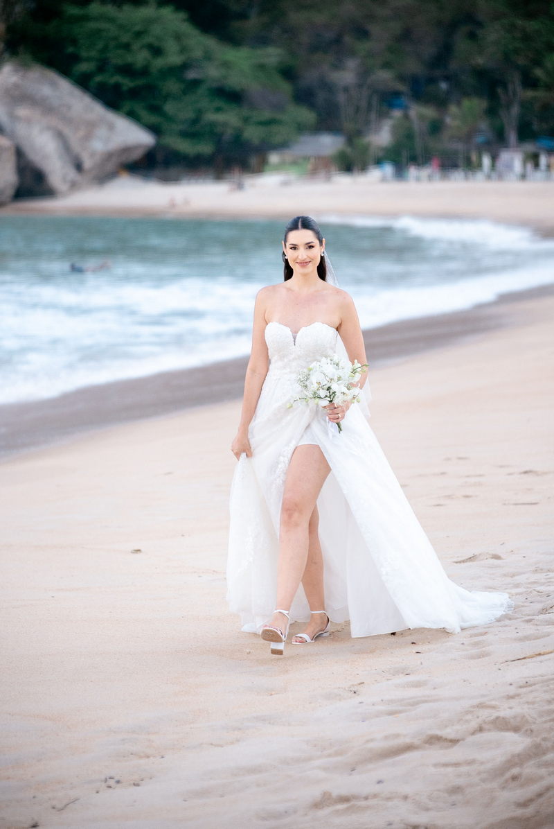 O ponto alto de toda a celebração, e que capturou a atenção de todos, foi a deslumbrante noiva Leticia. O seu vestido de noiva La Modelista, com o caimento impecável, abraçou sua silhueta de forma delicada, permitindo que ela se movesse com graça e naturalidade pela areia. O decote coração, um clássico atemporal, realçou a sua feminilidade, enquanto o corpete, adornado com uma renda delicada, trouxe romantismo. Mas foi a fenda alta, estrategicamente posicionada na perna esquerda, que trouxe um elemento de modernidade e sensualidade discreta. A beleza radiante de Leticia foi realçada pela maestria da @leticiachagasmakeup, que soube capturar a essência da noiva e traduzi-la em uma maquiagem e penteado impecáveis, resistentes à brisa do mar e à emoção do dia.
