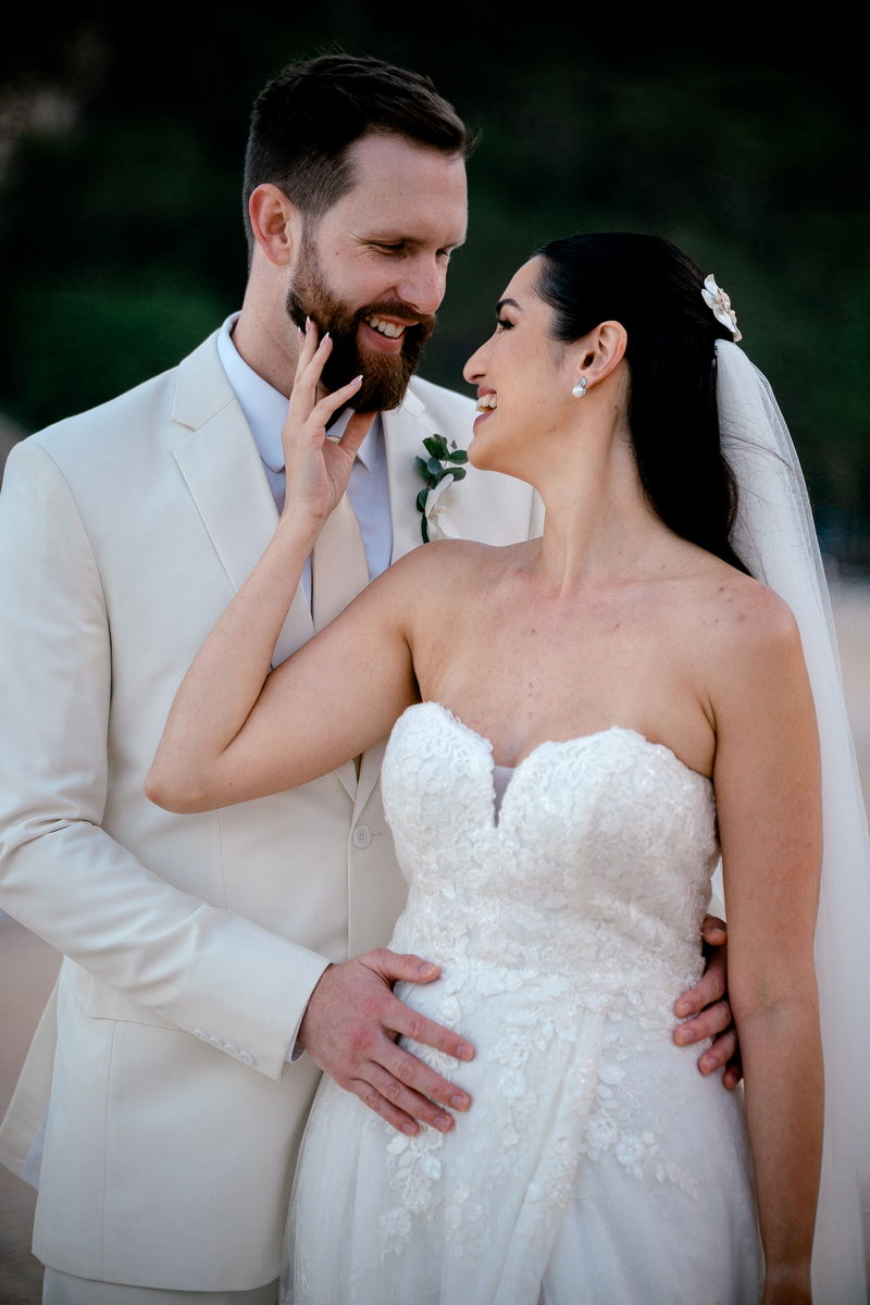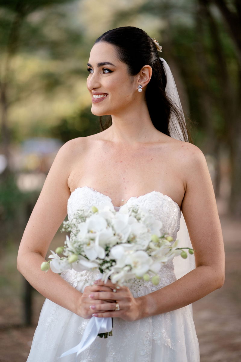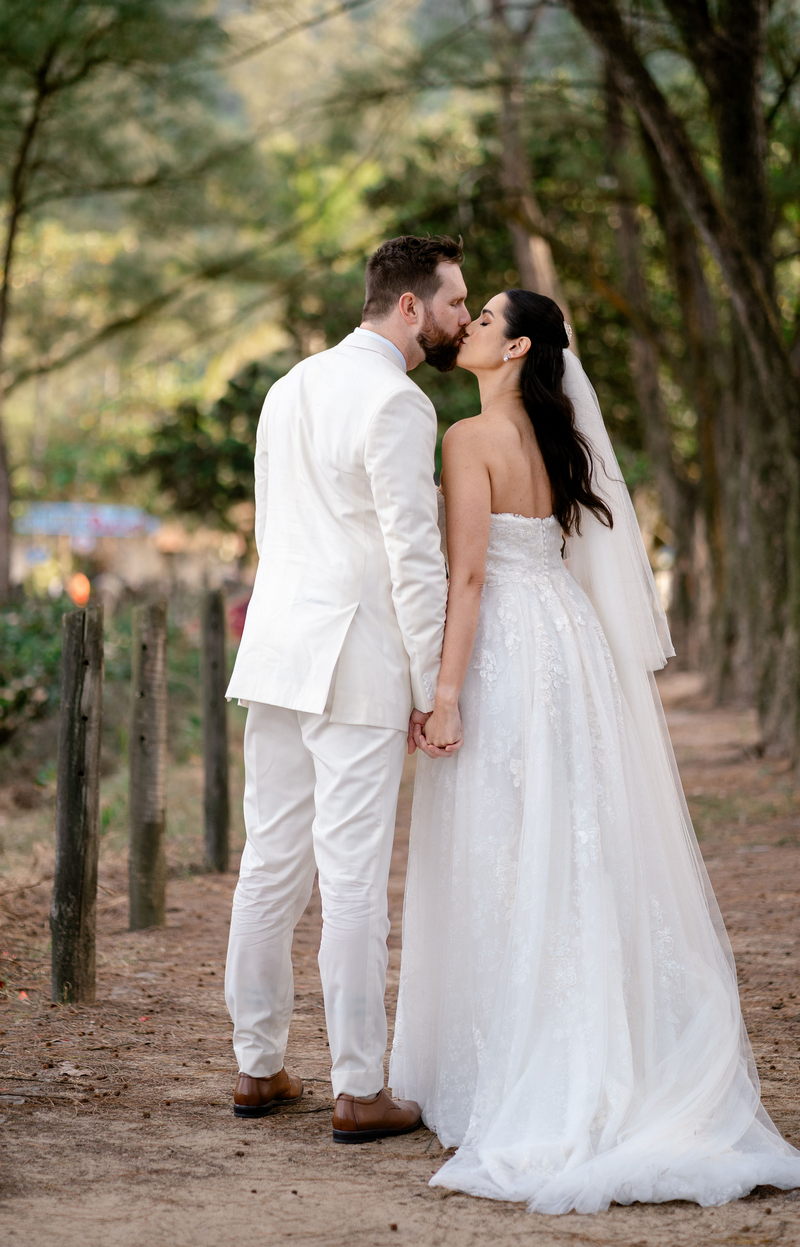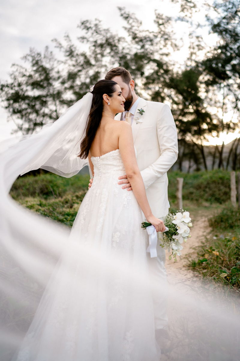 O ponto alto de toda a celebração, e que capturou a atenção de todos, foi a deslumbrante noiva Leticia. O seu vestido de noiva La Modelista, com o caimento impecável, abraçou sua silhueta de forma delicada, permitindo que ela se movesse com graça e naturalidade pela areia. O decote coração, um clássico atemporal, realçou a sua feminilidade, enquanto o corpete, adornado com uma renda delicada, trouxe romantismo. Mas foi a fenda alta, estrategicamente posicionada na perna esquerda, que trouxe um elemento de modernidade e sensualidade discreta. A beleza radiante de Leticia foi realçada pela maestria da @leticiachagasmakeup, que soube capturar a essência da noiva e traduzi-la em uma maquiagem e penteado impecáveis, resistentes à brisa do mar e à emoção do dia.