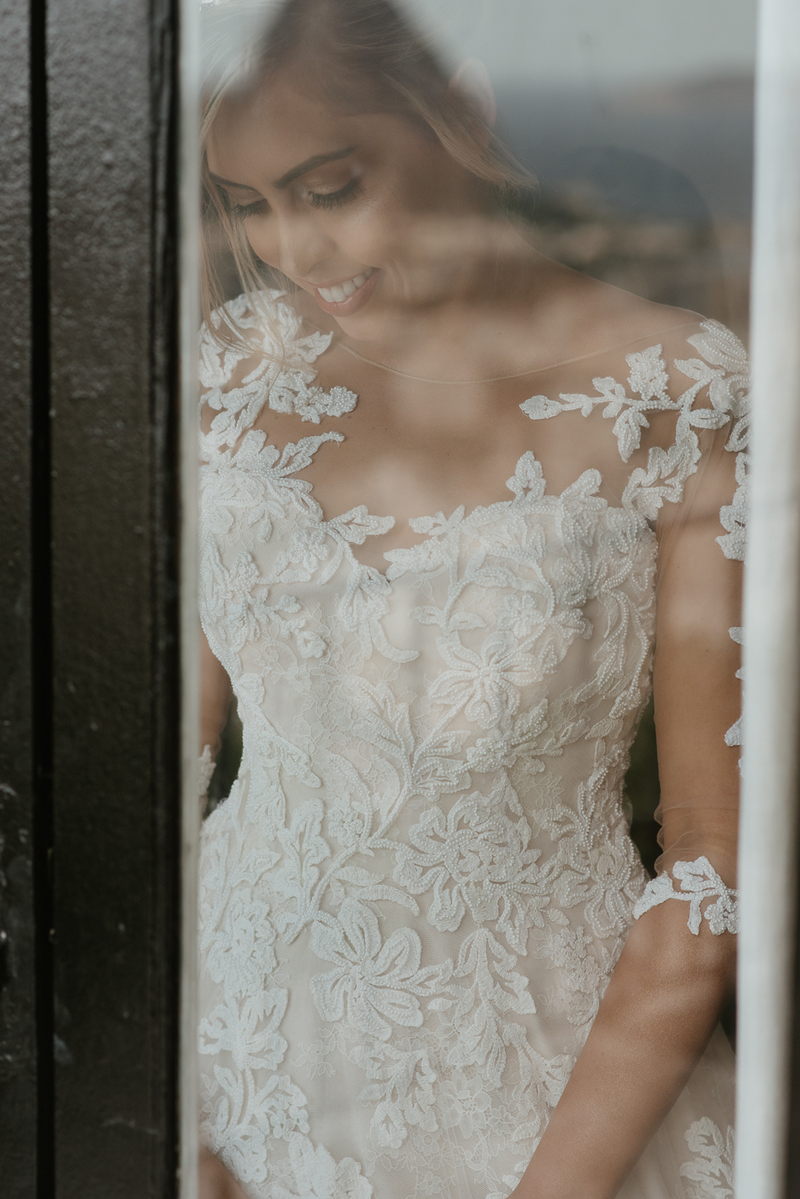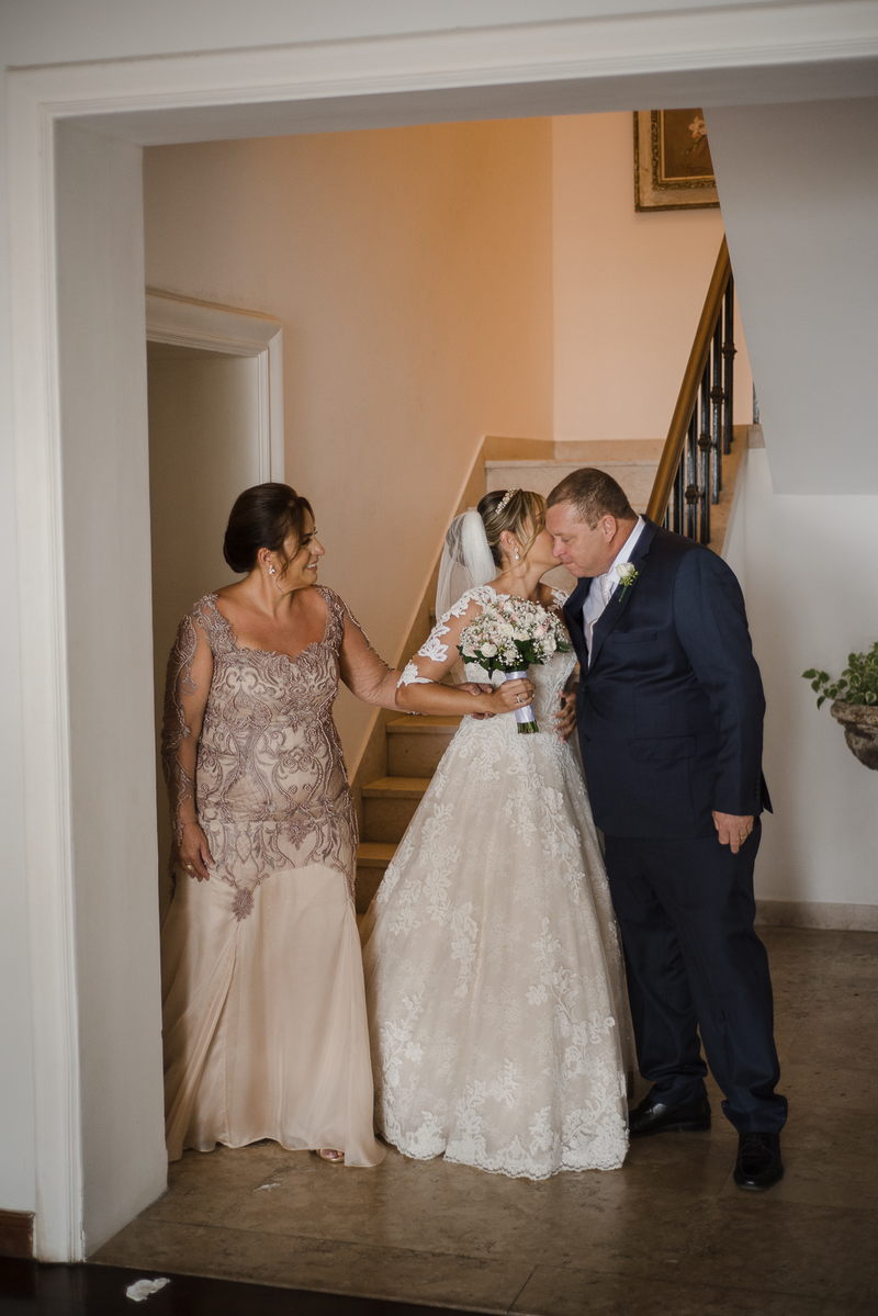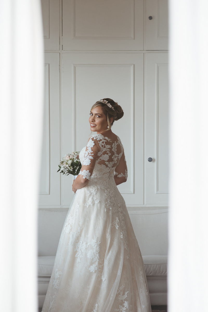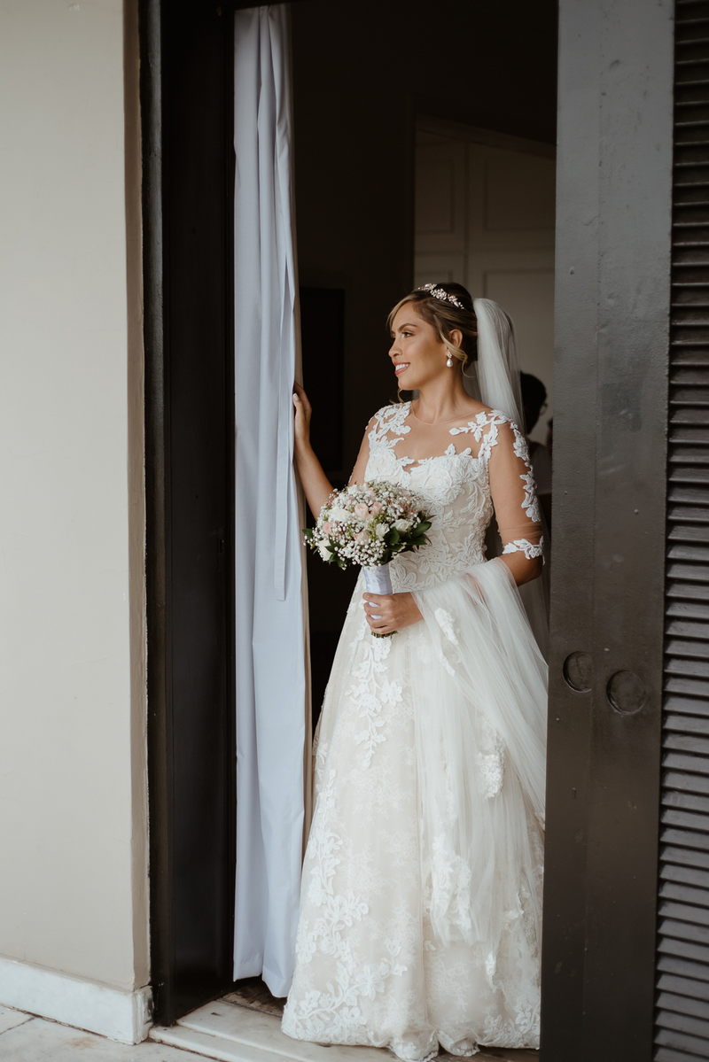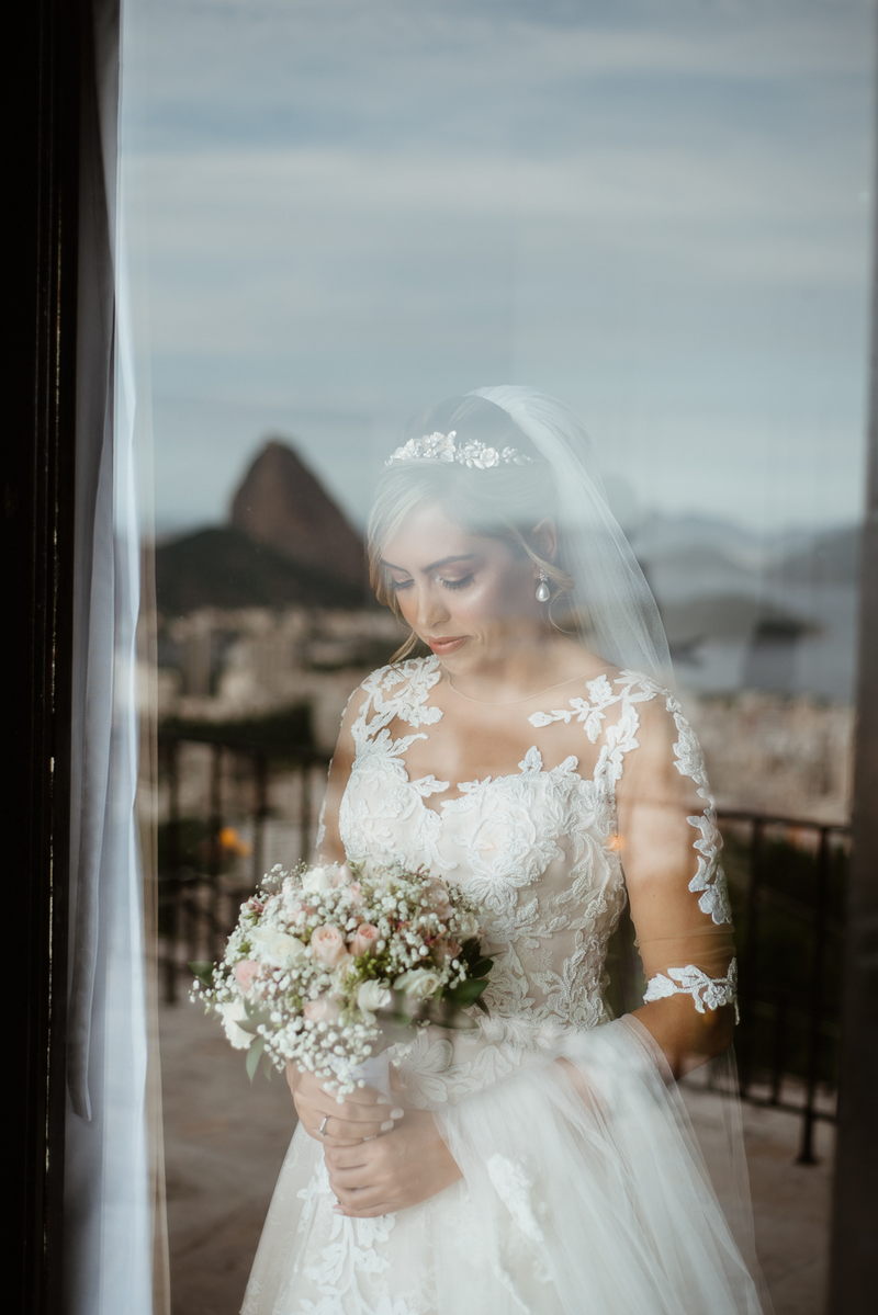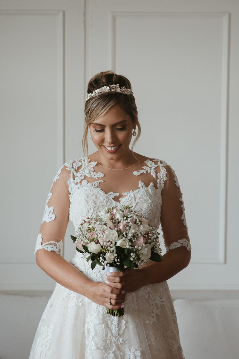 Ela optou por um modelo La Modelista perfeito, com detalhes incríveis em renda, transparência nas mangas e um caimento maravilhoso que realçou ainda mais suas curvas. Uma noiva que transbordava felicidade, simpatia e beleza. Como não amar?