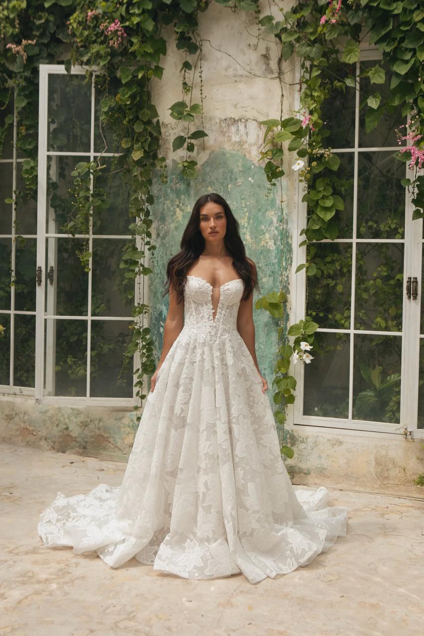 Decotes como o tomara que caia deixam o visual mais leve e ajudam a quebrar a formalidade excessiva. No caso do modelo a seguir, o frescor e o conforto trazidos pelo decote permitem que a noiva opte pela saia mais rodada, sem que o visual se torne pesado.