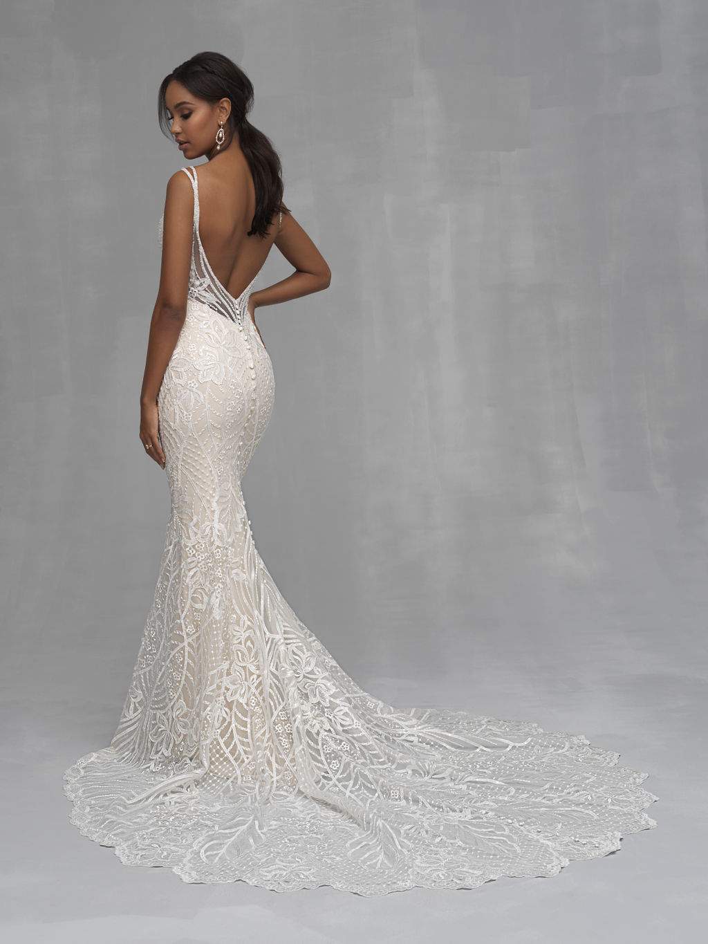 Aqui a ideia é a mesma do tópico anterior: trazer algum elemento mais romântico e feminino para equilibrar a sensualidade do corte semi sereia. Esse vestido tem aplicações de flores no corpo e uma transparência muito discreta por baixo.