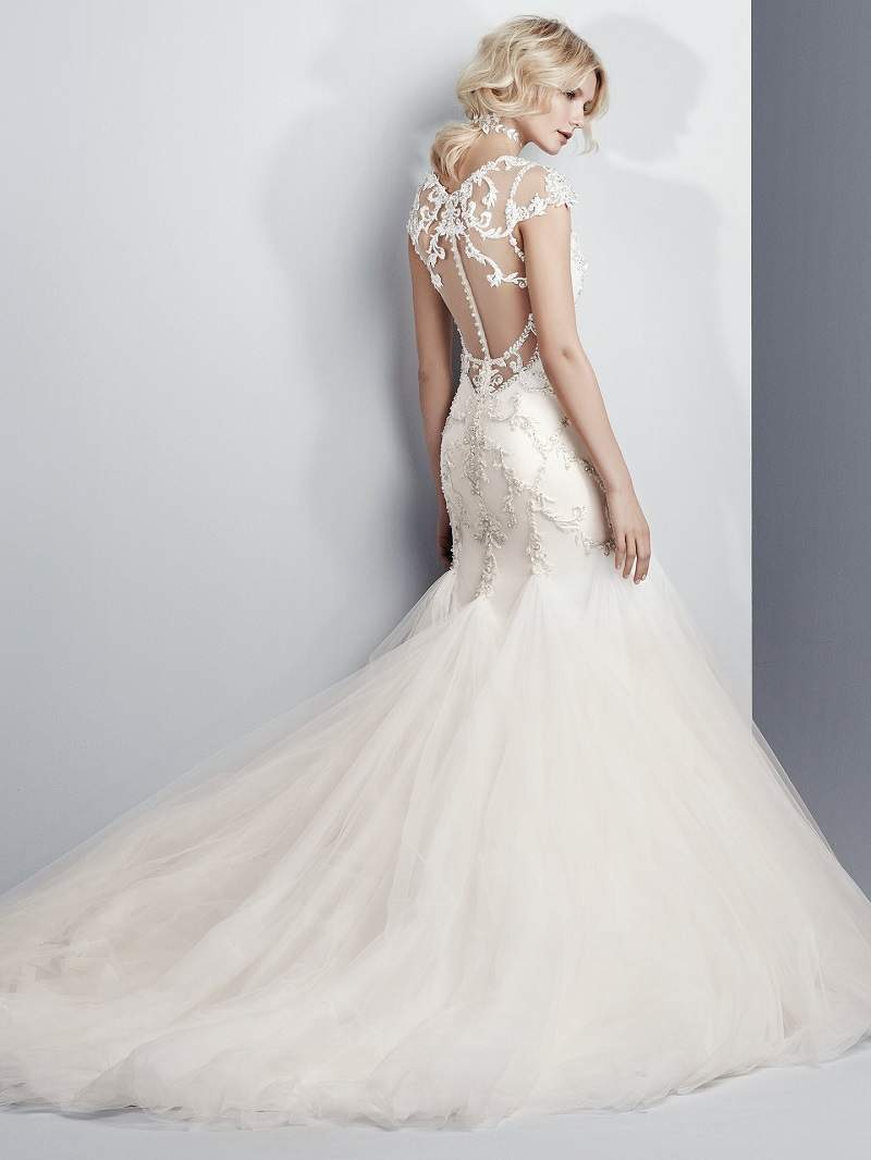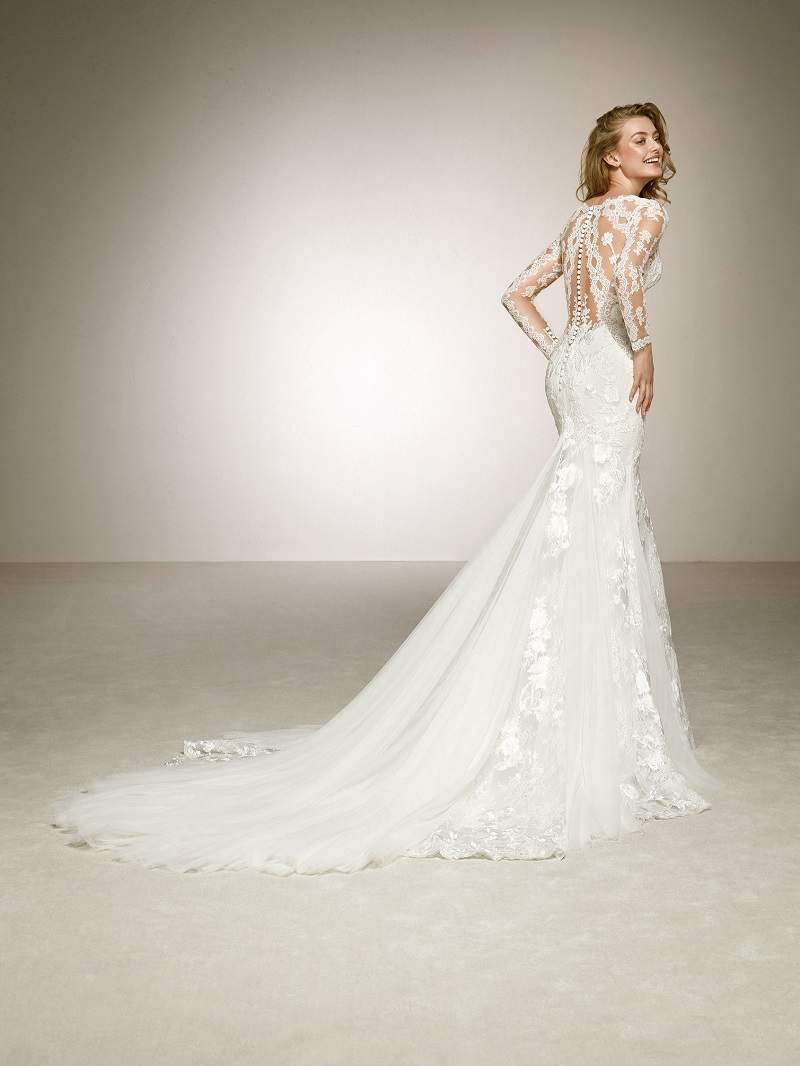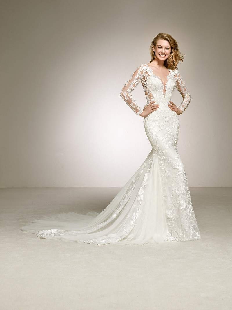 Por fim, a mistura perfeita de tule, renda e transparências dão origem a uma das peças mais espetaculares e sensuais da coleção Bridal. Outros elementos marcantes nesse vestido são a charmosa manga longa e o poderoso decote profundo que chega quase até o umbigo. O corte sereia acentuado ganha intensidade com a saia volumosa.