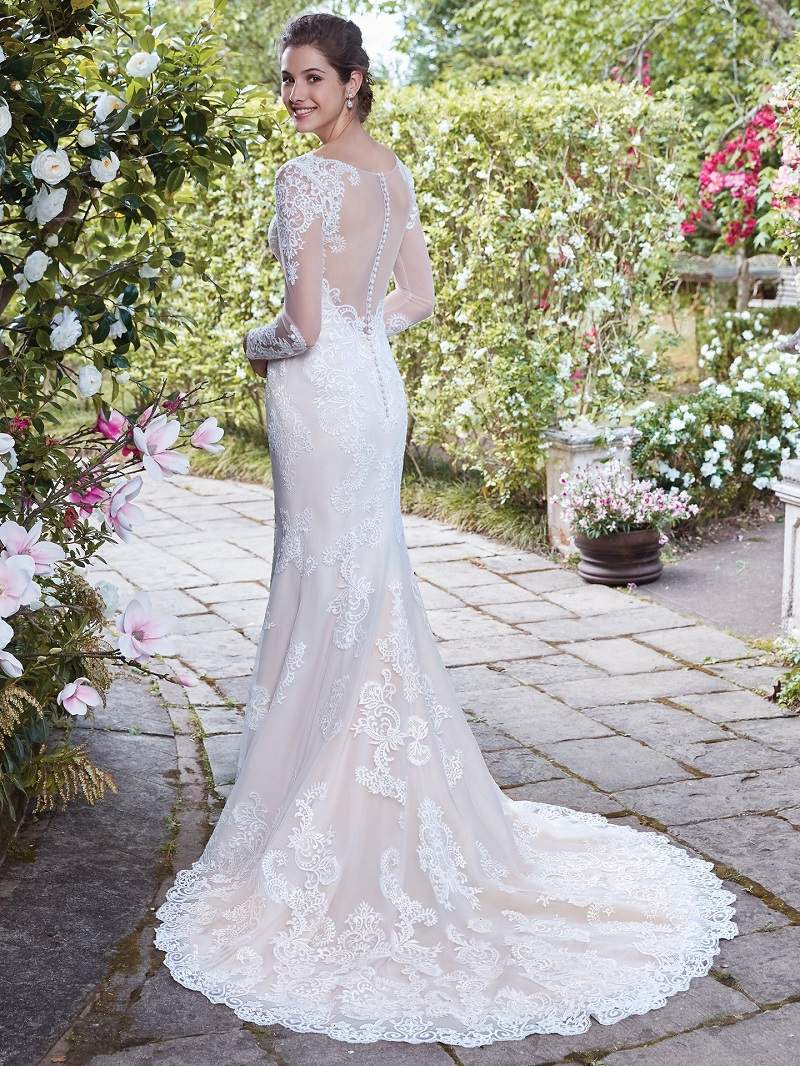 A manga comprida é símbolo de elegância instantânea. O primeiro modelo é todo confeccionado em renda e tule, e leva aplicações de gaza na saia. O decote ombro a ombro ilumina colo e rosto, e na parte de atrás exibe um delicado acabamento para as costas nuas.