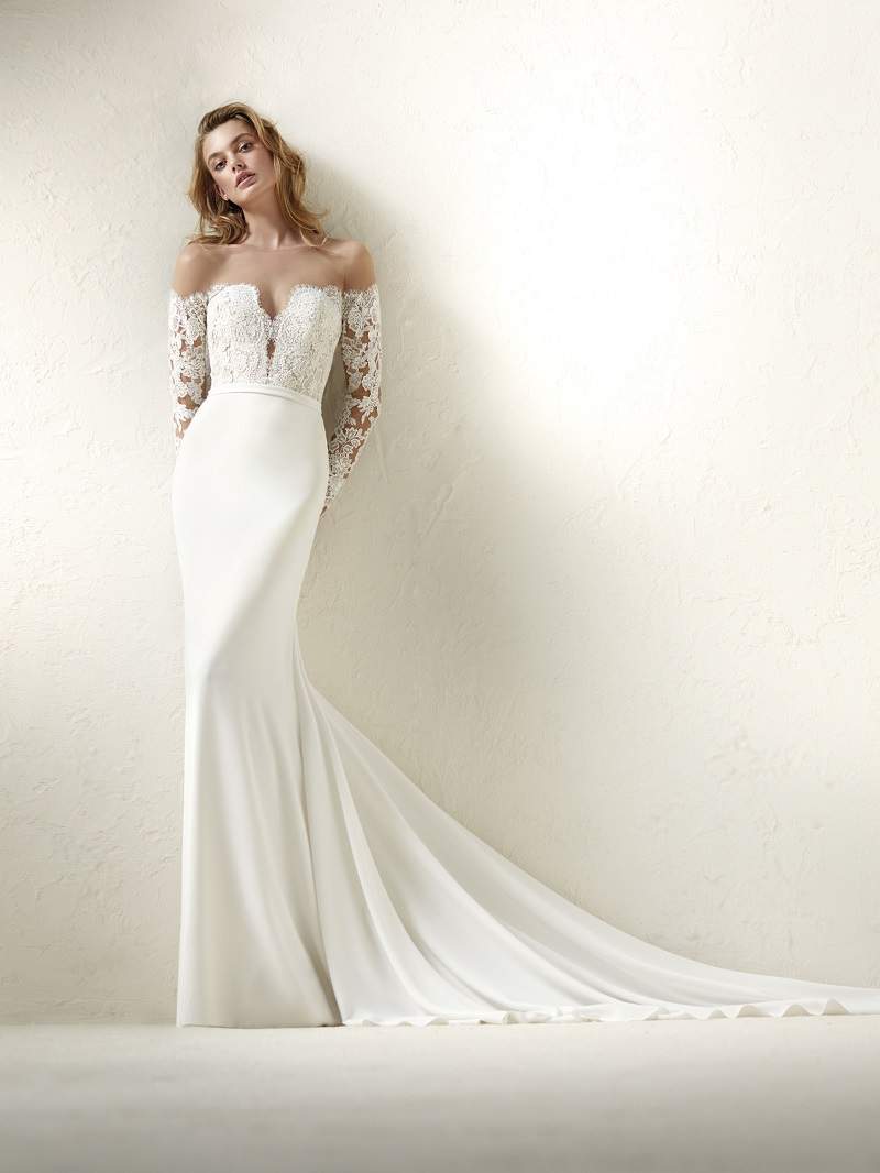 O segundo vestido é mesmo um caso de amor. O modelo sereia de cintura alta une crepe e tule na saia lisa e renda e guipure no corpo, criando um belíssimo efeito duas peças. O decote ombro a ombro tem um requintado efeito tatuagem, tanto nas mangas quanto no decote profundo frontal.