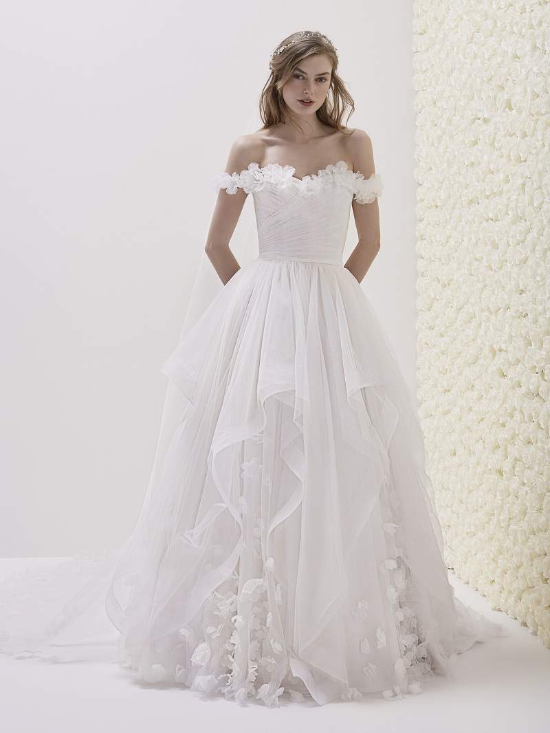 Se você quer um vestido de noiva diferente, mas sem abrir mão da saia ampla, invista em uma peça que tenha algo de inusitado. Nesse caso, a saia é formada por camadas irregulares, que fogem do clássico.