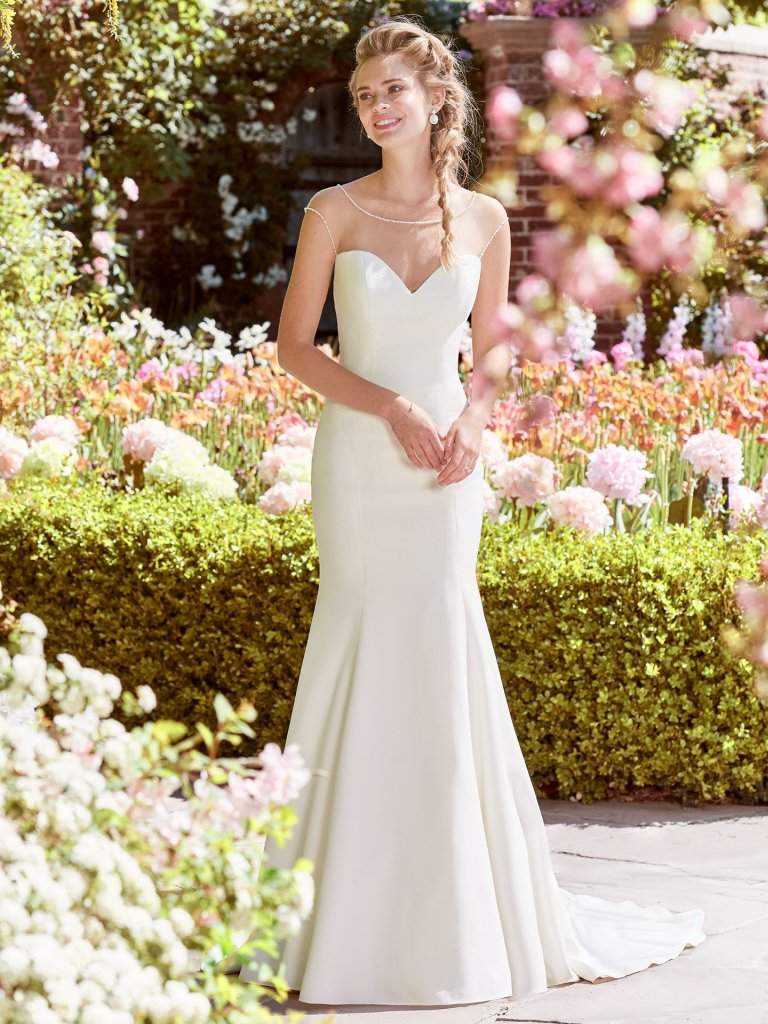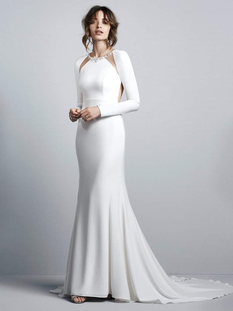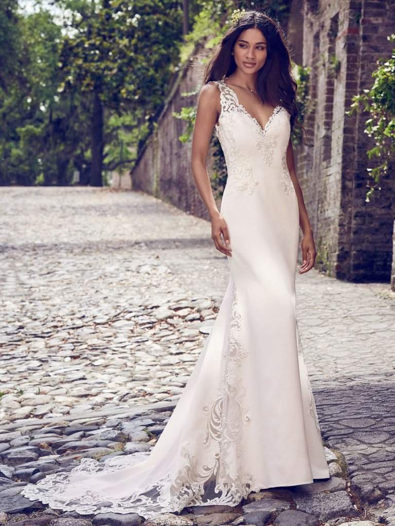 A princesa Meghan Markle veio para consolidar de vez os vestidos de noiva lisos como opções modernas, mas sem ousar. Para quem busca esse equilíbrio, esse modelo é perfeito, e ainda tem um detalhe de renda apenas nas costas para garantir um charme a mais.