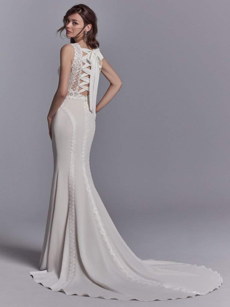 Essa peça é outro exemplo, com destaque para o decote em tule – que também está na moda para as noivas – e os botões na parte de trás até a altura do quadril, para quem não quer abandonar de vez o clássico.